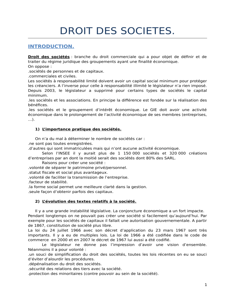 Droit des Sociétés : Introduction et Existence Juridique