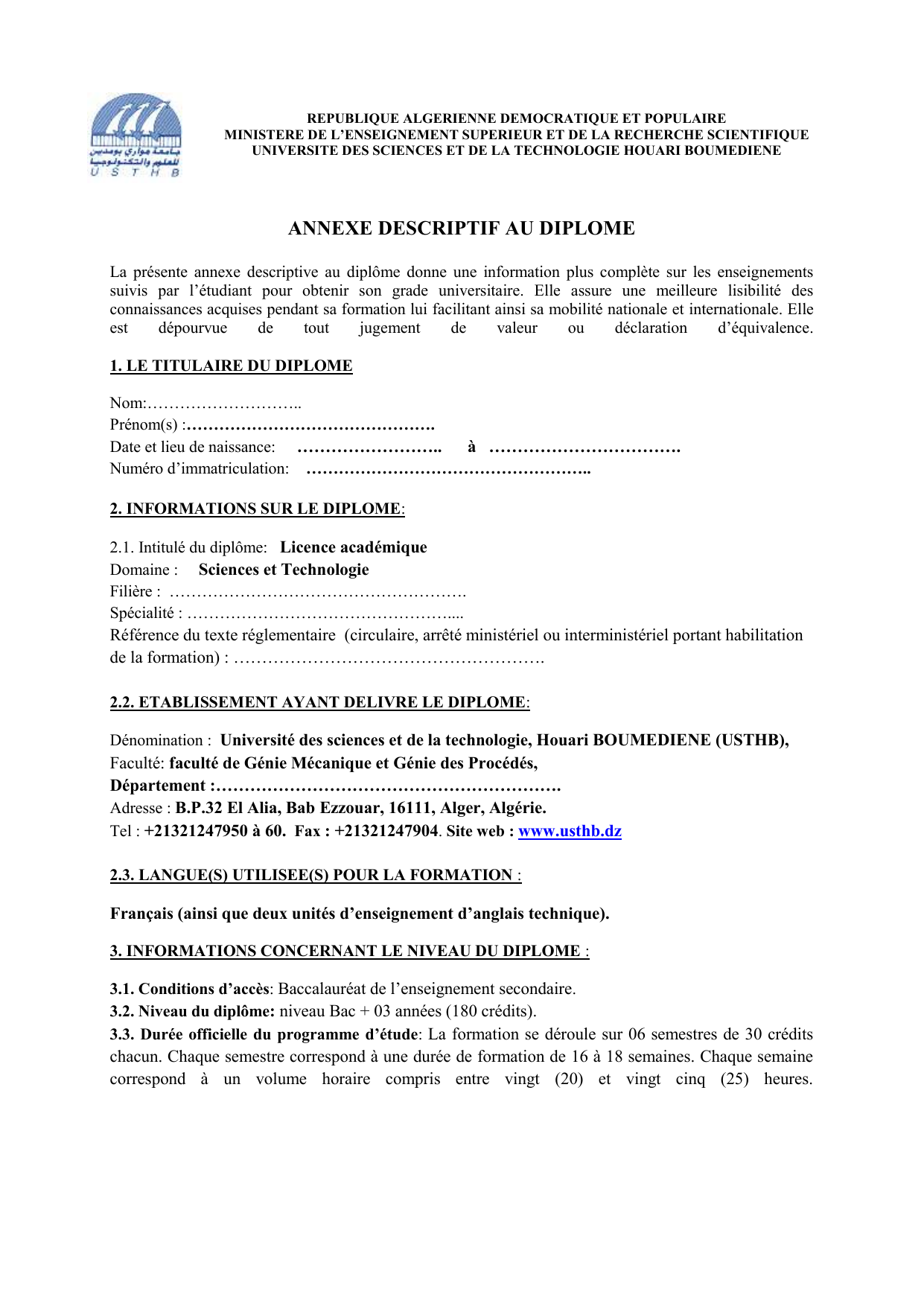 Adresse : B.P.32, EL alia, Bab Ezzouar, 16111, Alger, Algérie. Tél : +213 21 24 79 50 à 60 Fax: