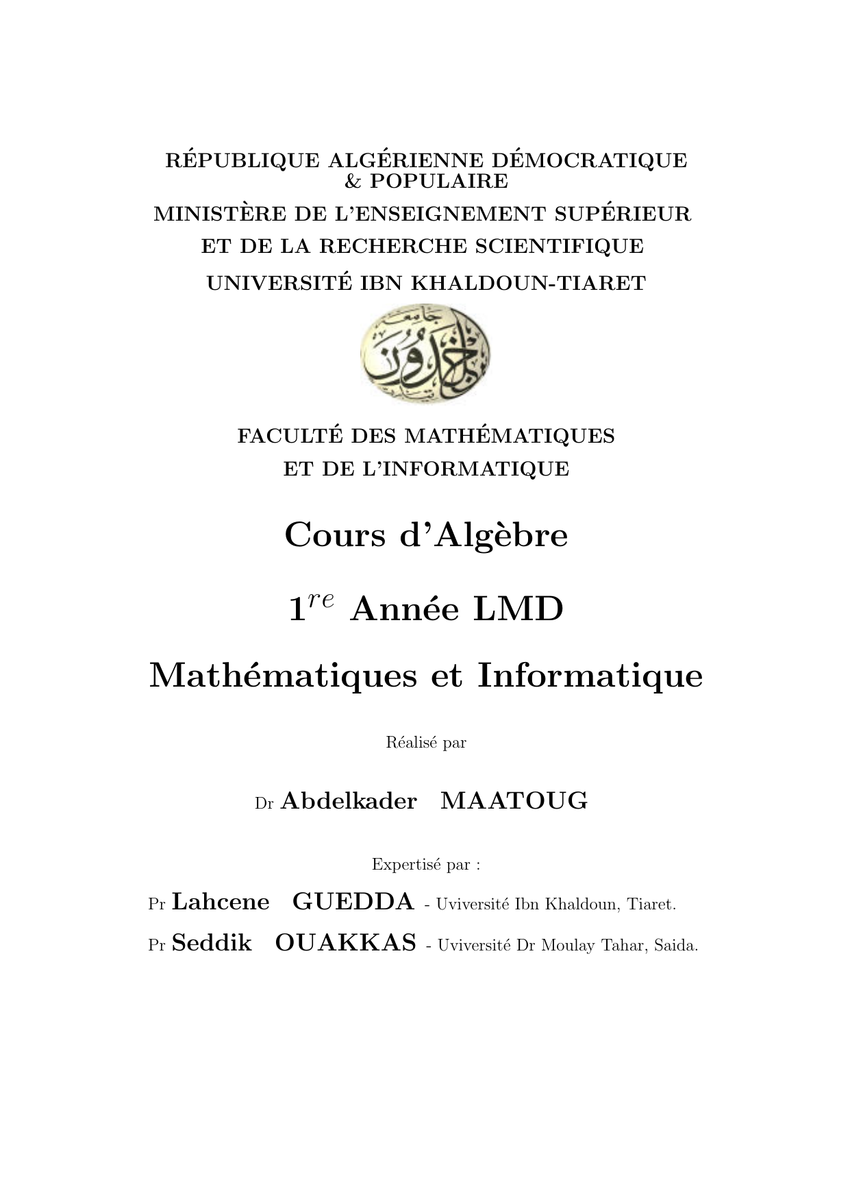 Cours d'Algèbre 1re Année LMD Mathématiques et Informatique