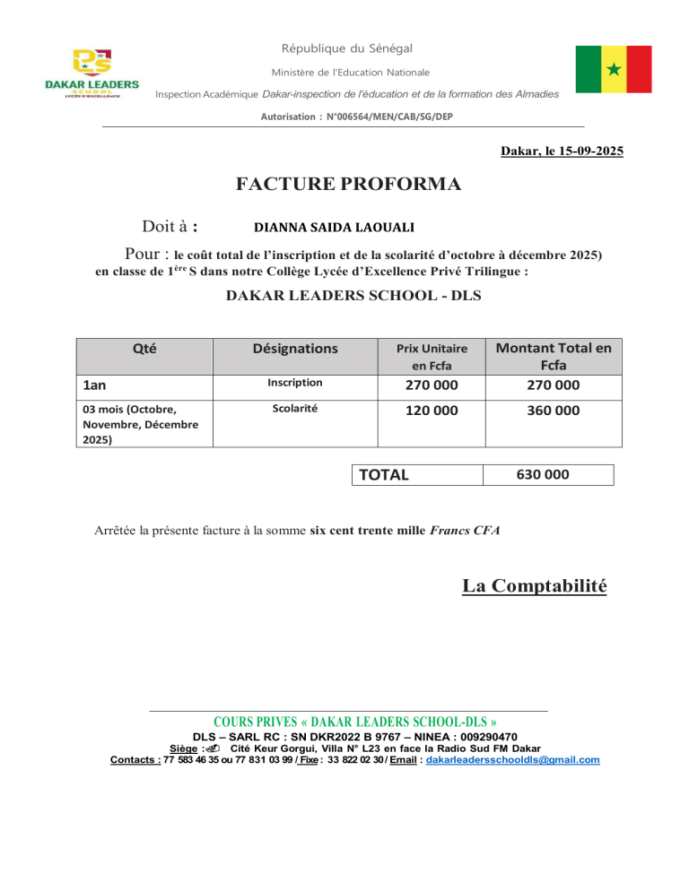 Facture Proforma Dakar Leaders School - Frais Scolarité 1ère S