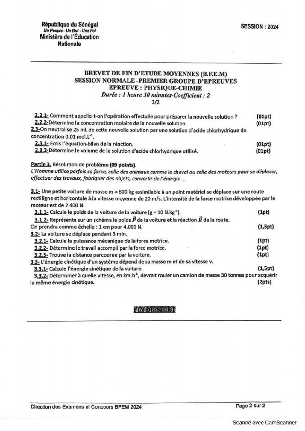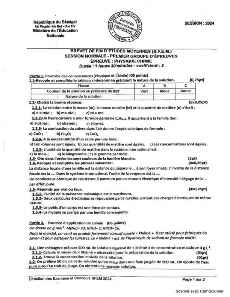 Examen BFEM Physique-Chimie: Chimie et Physique