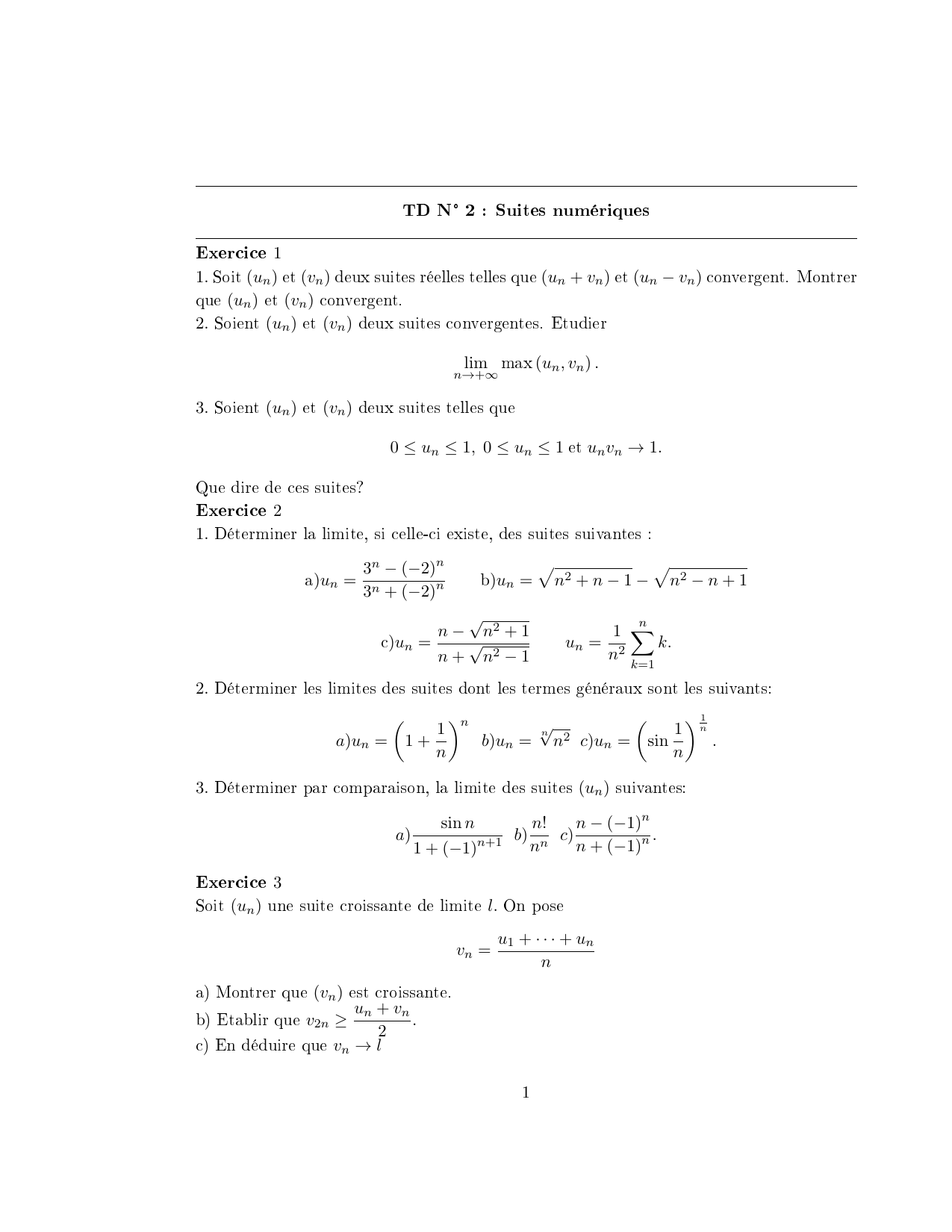 TD N° 2 : Suites numériques - Exercices de convergence et limites