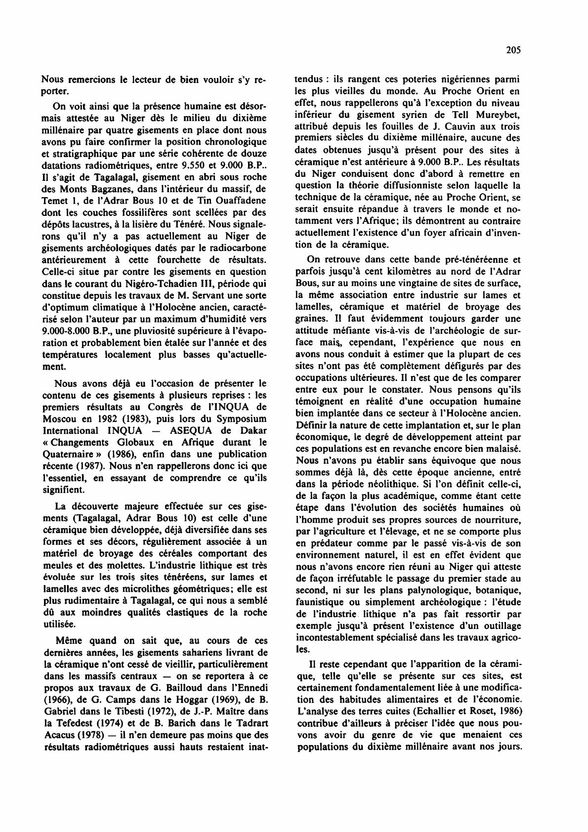 Plusieurs gisements découverts et datés par l'auteur depuis 1978 dans l'Air et le Ténéré fournissent