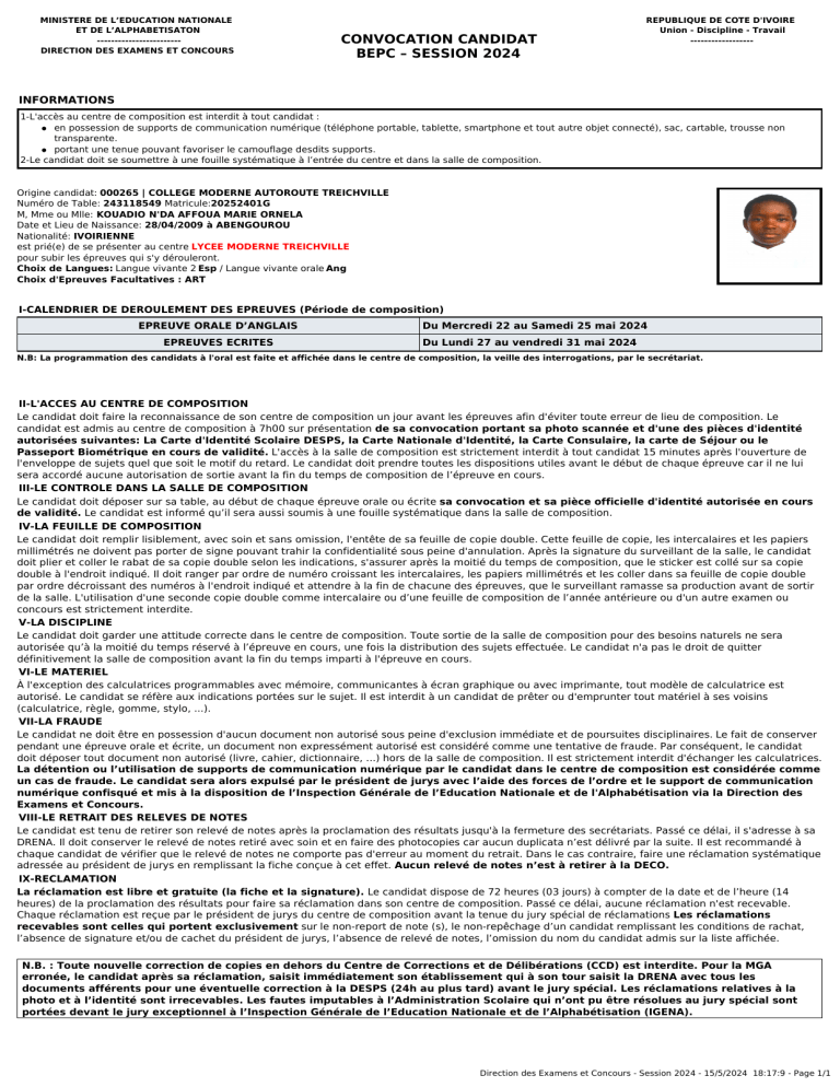 N.B: La programmation des candidats à l'oral est faite et affichée dans le centre de composition, la veille des interrogations, par le secrétariat.