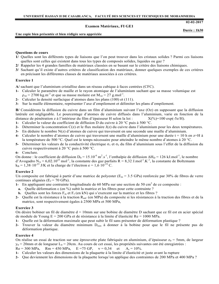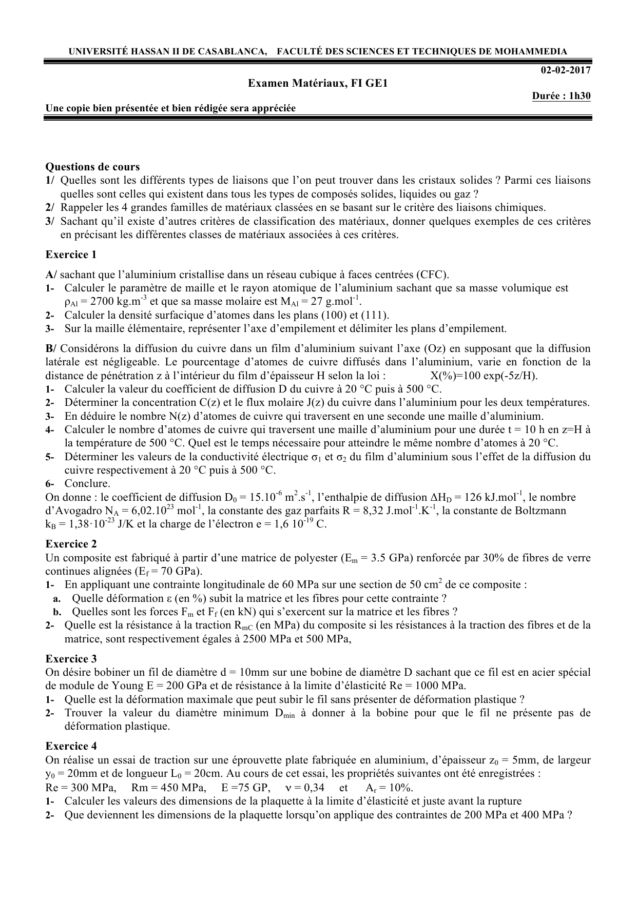 Examen Matériaux FI GE1 - Université Hassan II Casablanca 2017