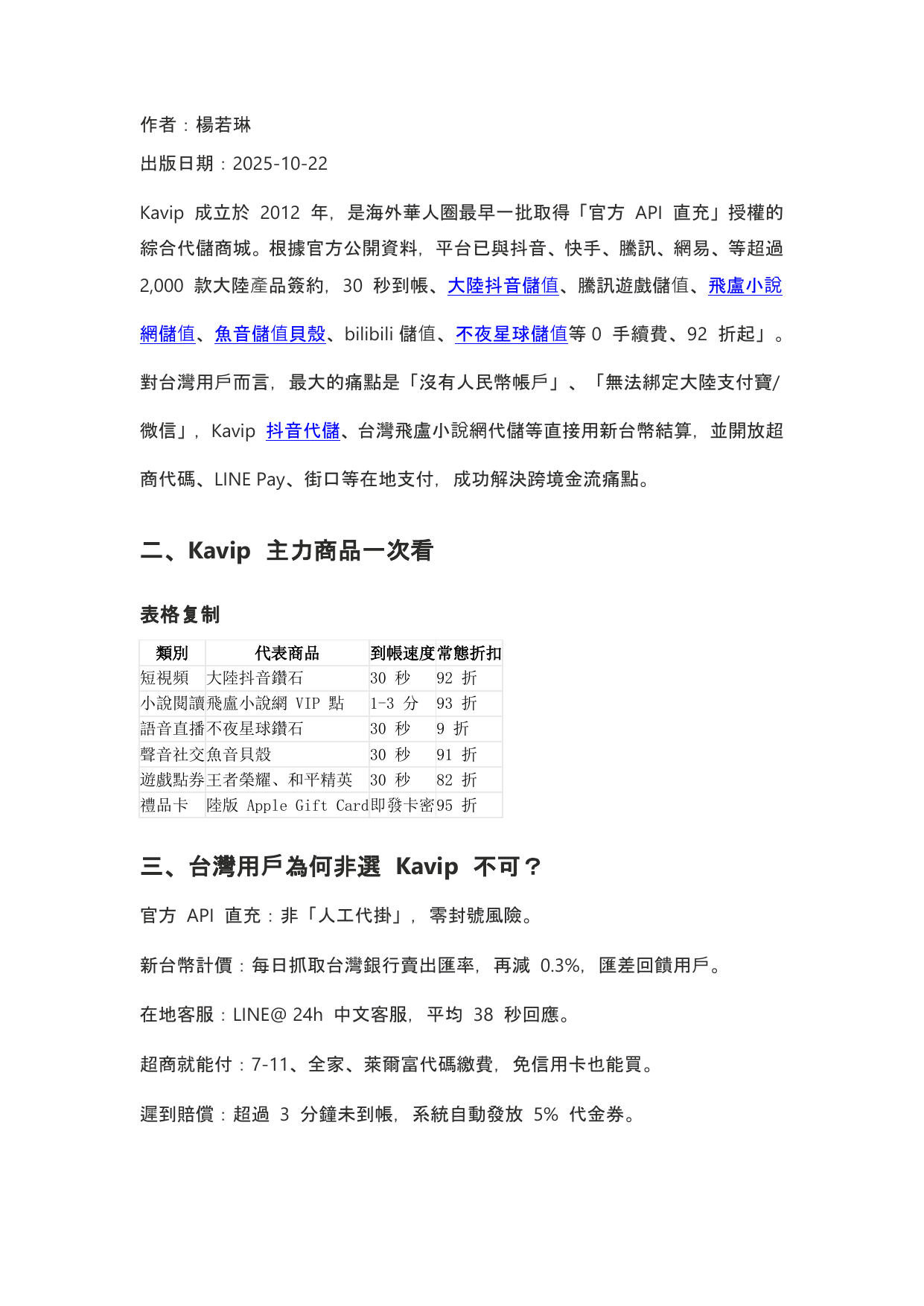 結論:Kavip 並非「話術平台」,而是真正取得官方 API 的白帽業者;對於無