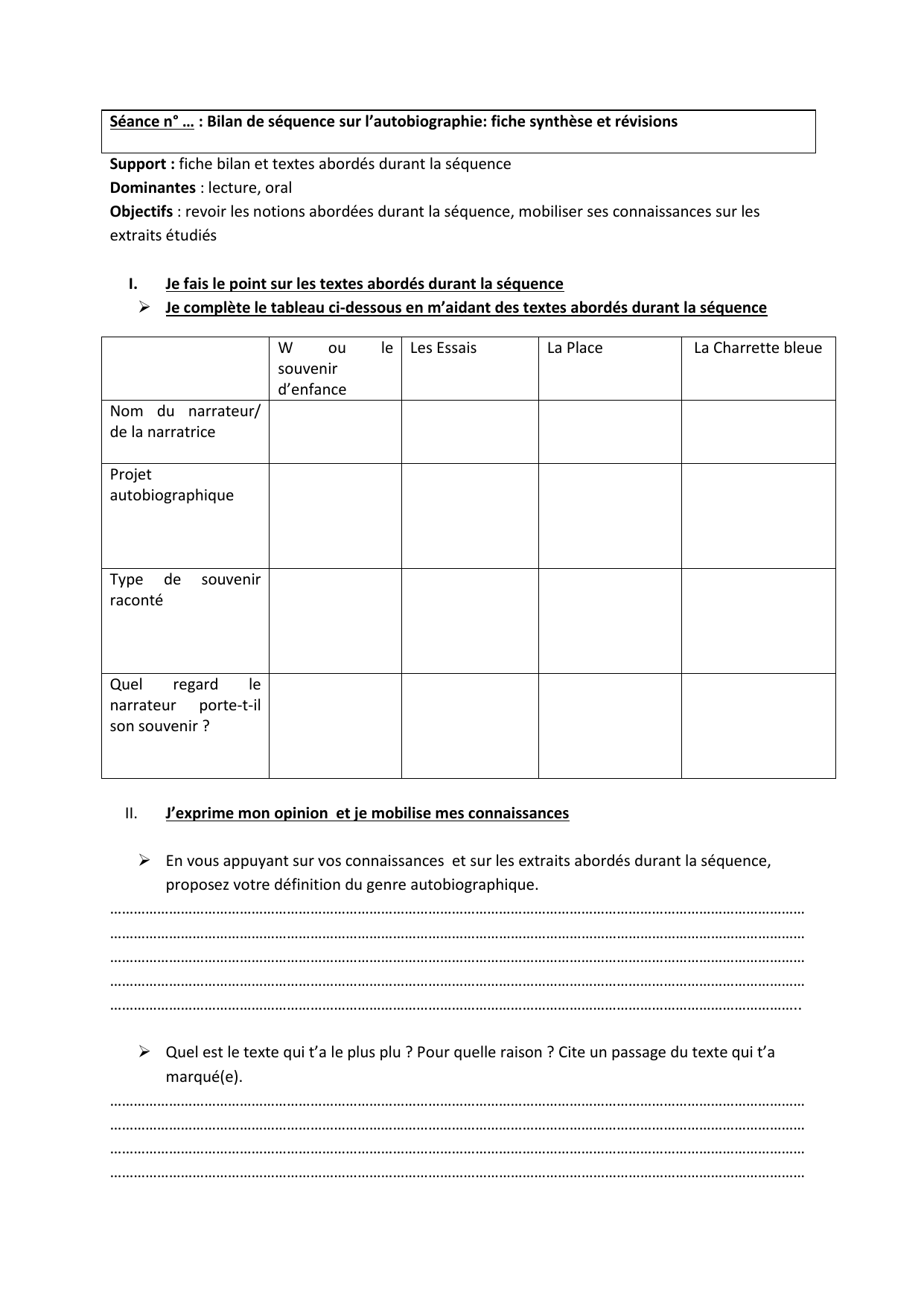 Séance n° … : Bilan de séquence sur l’autobiographie: fiche synthèse et révisions