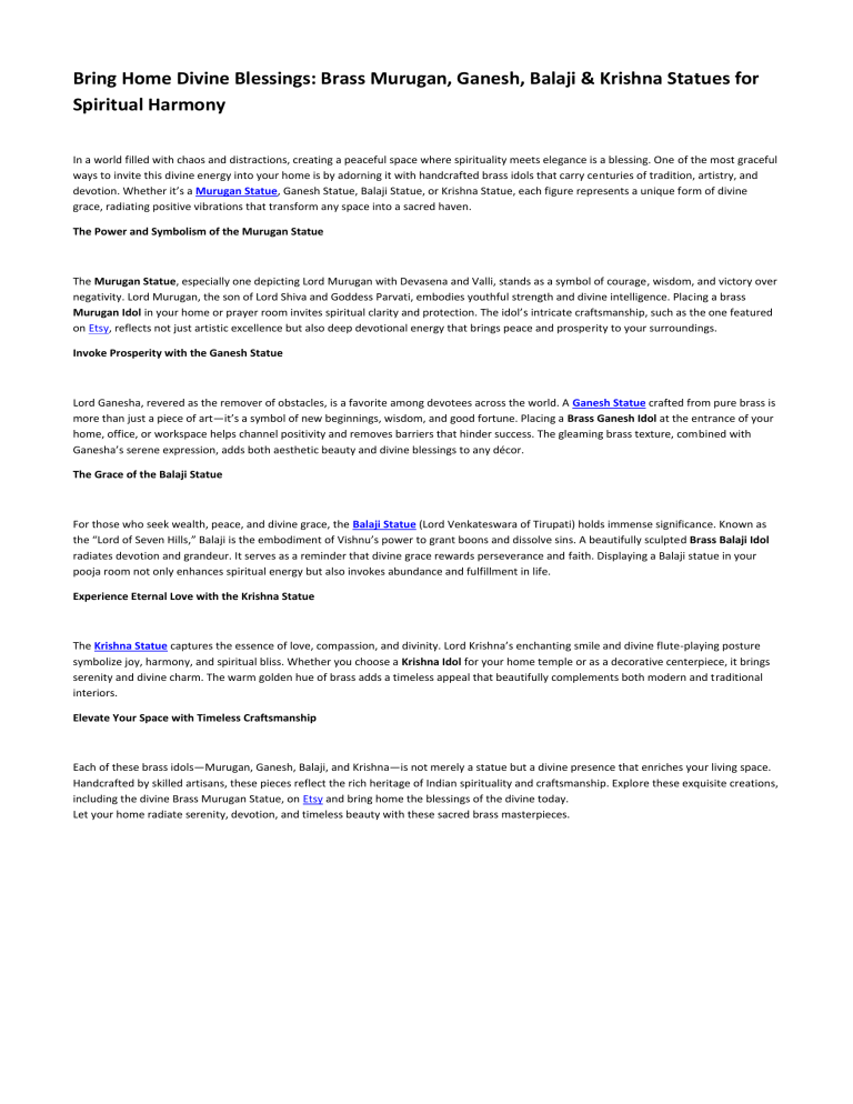devotion. Whether it’s a Murugan Statue, Ganesh Statue, Balaji Statue, or Krishna Statue, each figure represents a unique form of divine