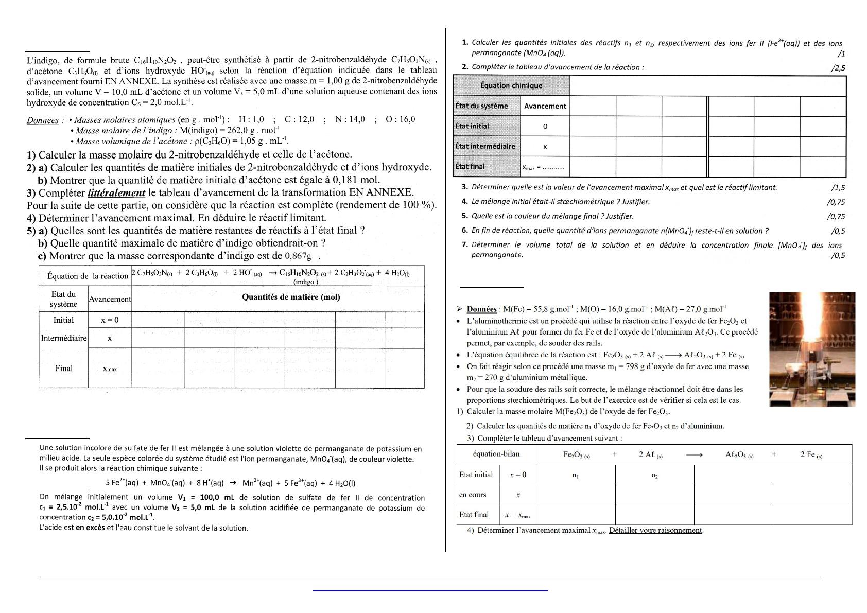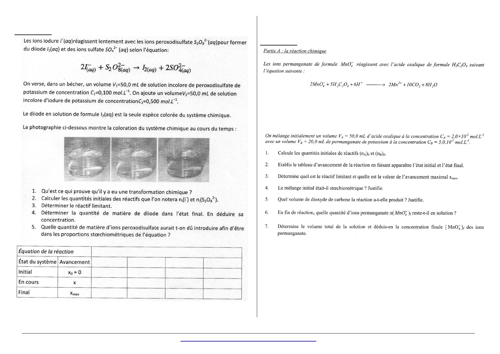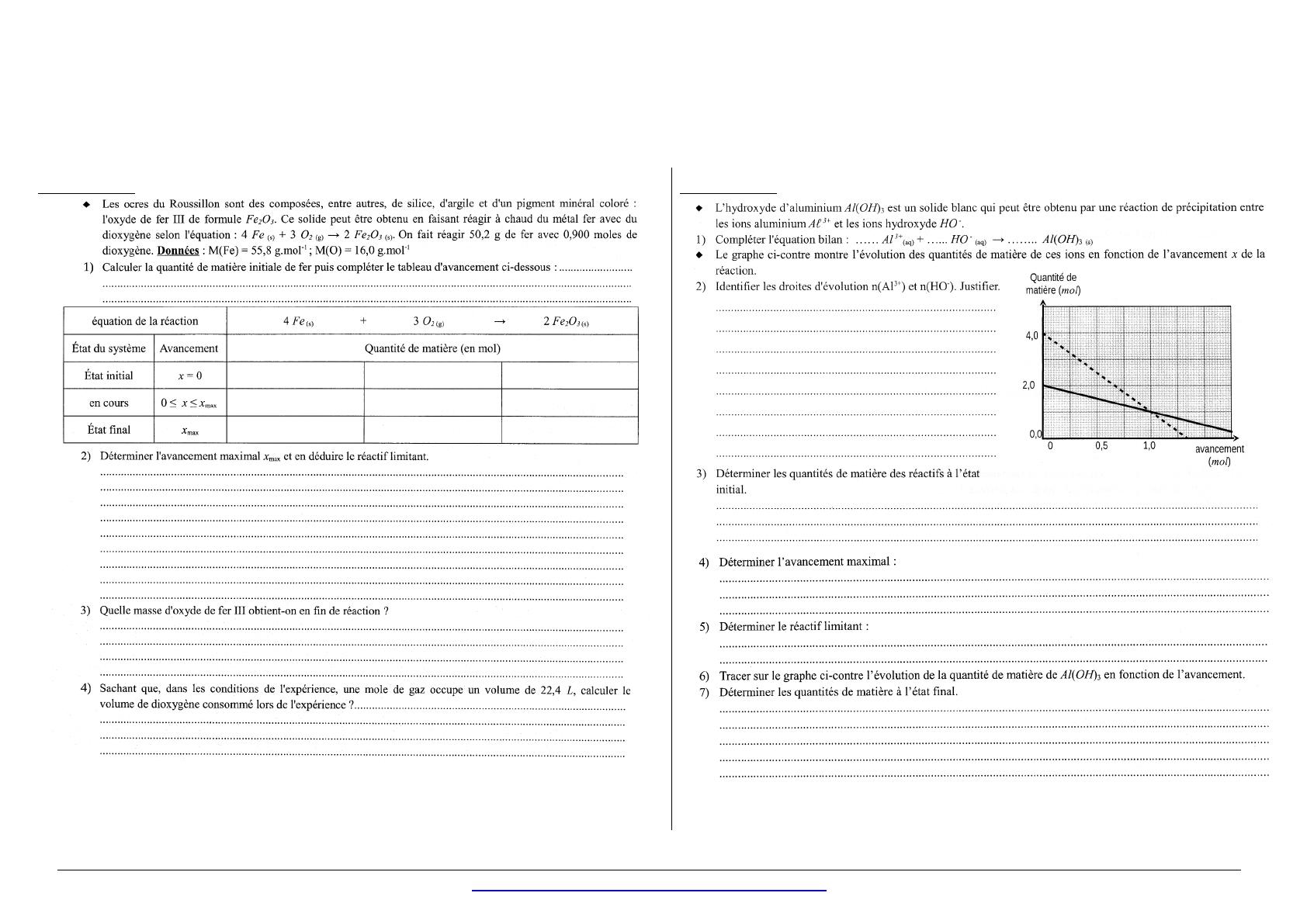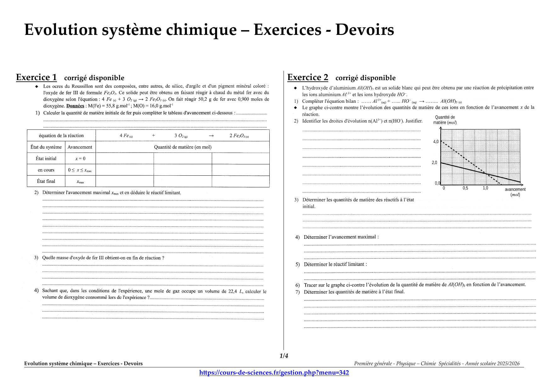 Evolution système chimique – Exercices - Devoirs Première générale - Physique – Chimie Spécialités - Année scolaire 2025/2026