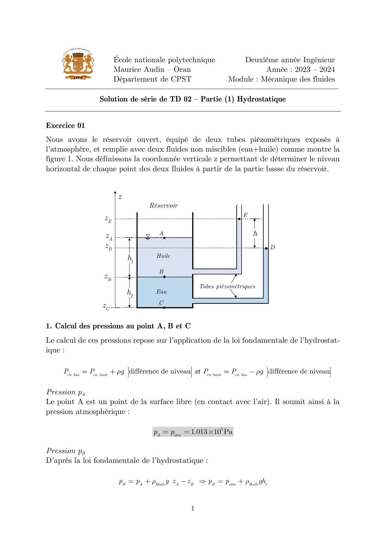Solution TD 02 Hydrostatique - Mécanique des Fluides ENPO Oran