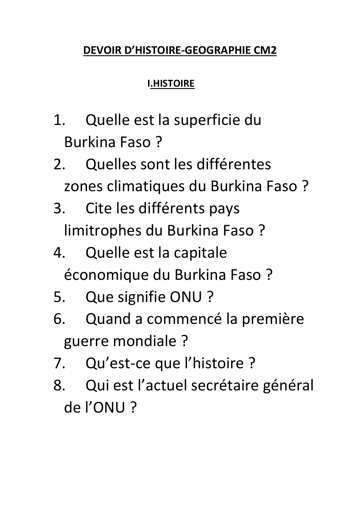 Devoir Histoire-Géographie CM2 - Burkina Faso, ONU, Première Guerre Mondiale