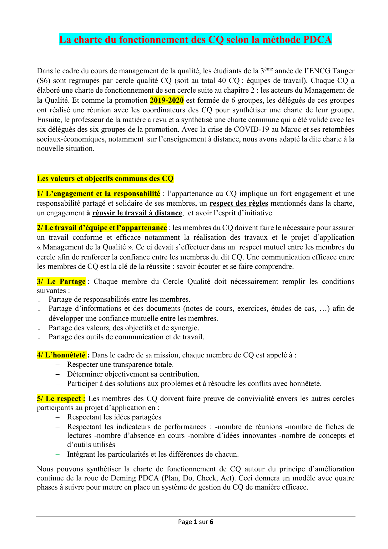 La charte du fonctionnement des CQ selon la méthode PDCA