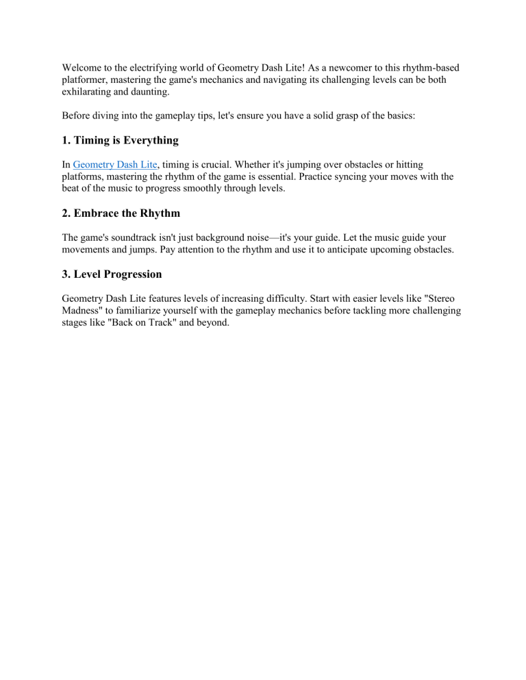 Welcome to the electrifying world of Geometry Dash Lite! As a newcomer to this rhythm-based