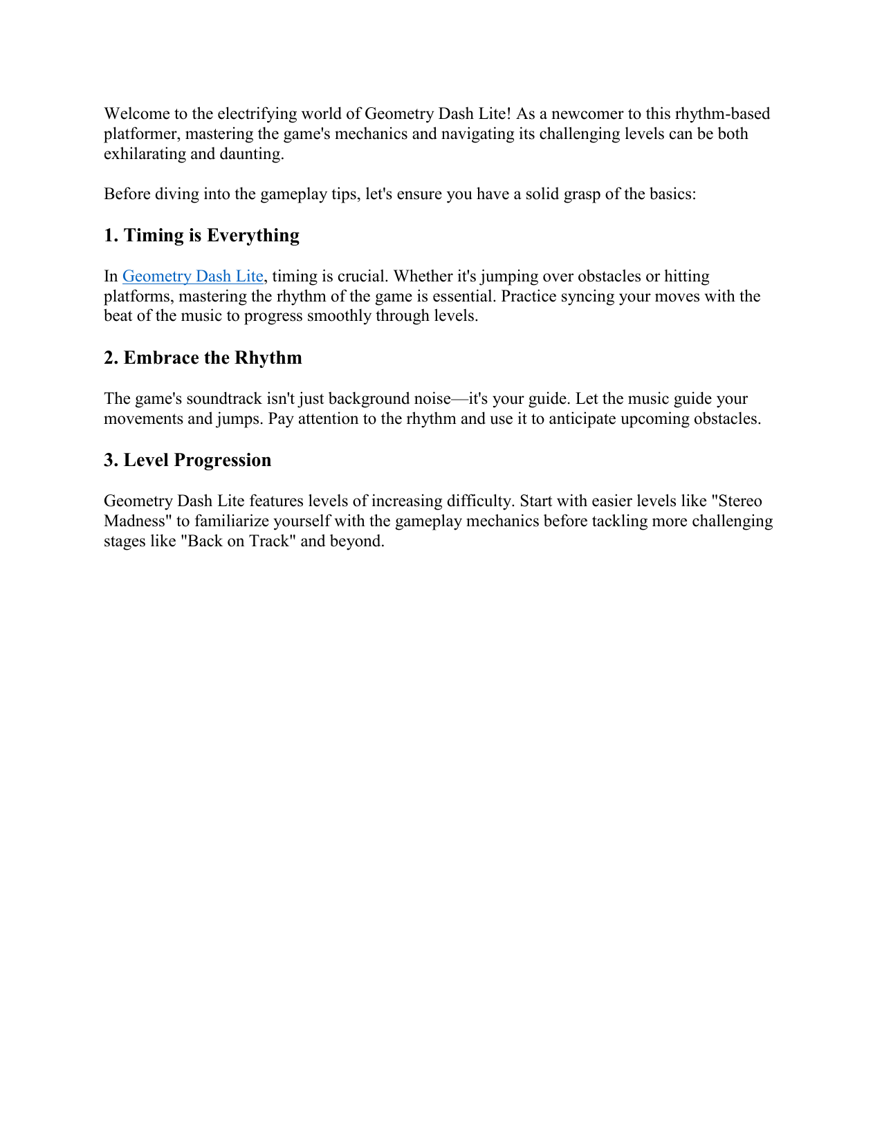 In Geometry Dash Lite, timing is crucial. Whether it's jumping over obstacles or hitting
