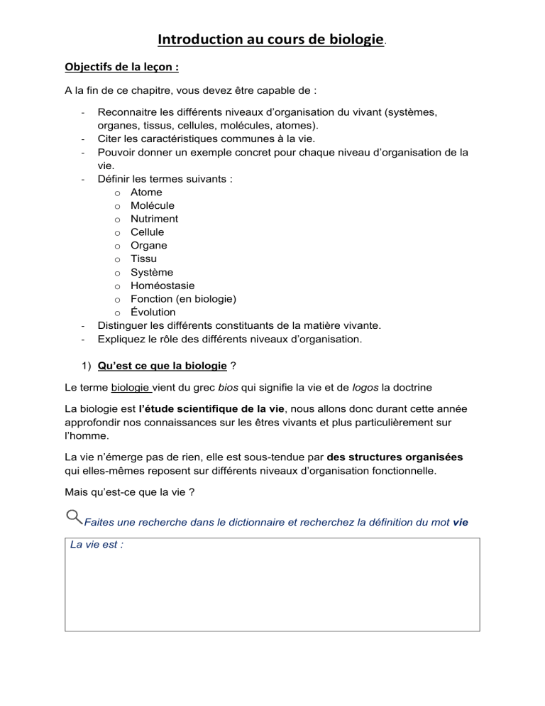 d’un être vivant est la cellule, son étude fera l’objet d’un chapitre important