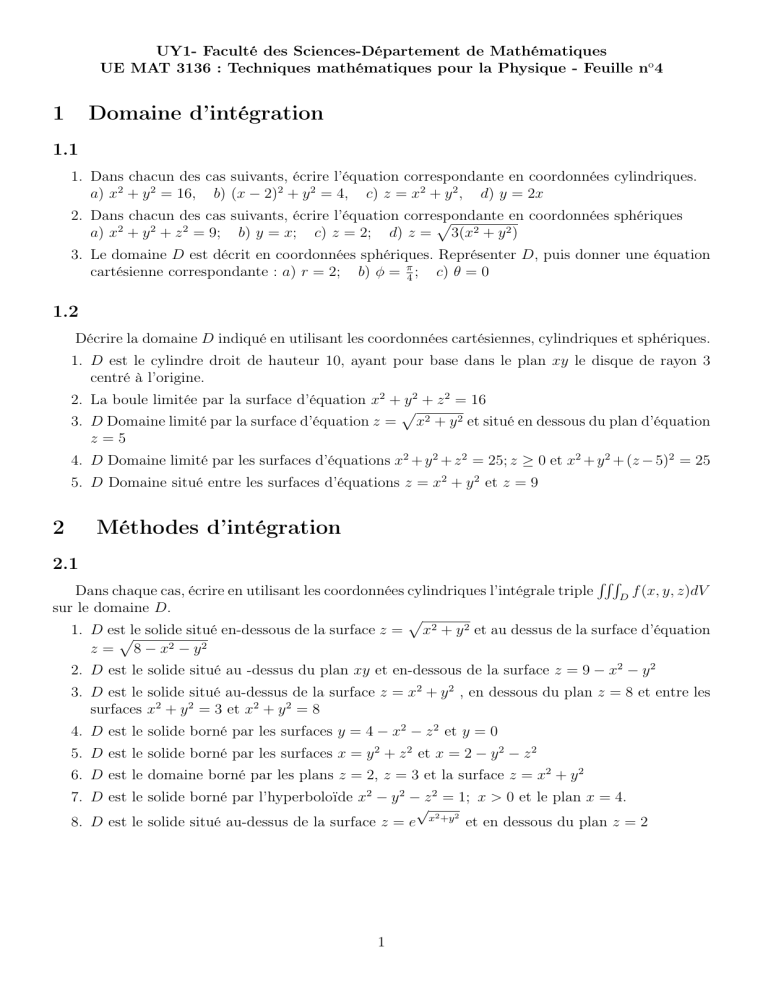 Dans chaque cas calculer l’intégrale RRRDf(x, y, z)dV en utilisant les coordonnées cylindriques
