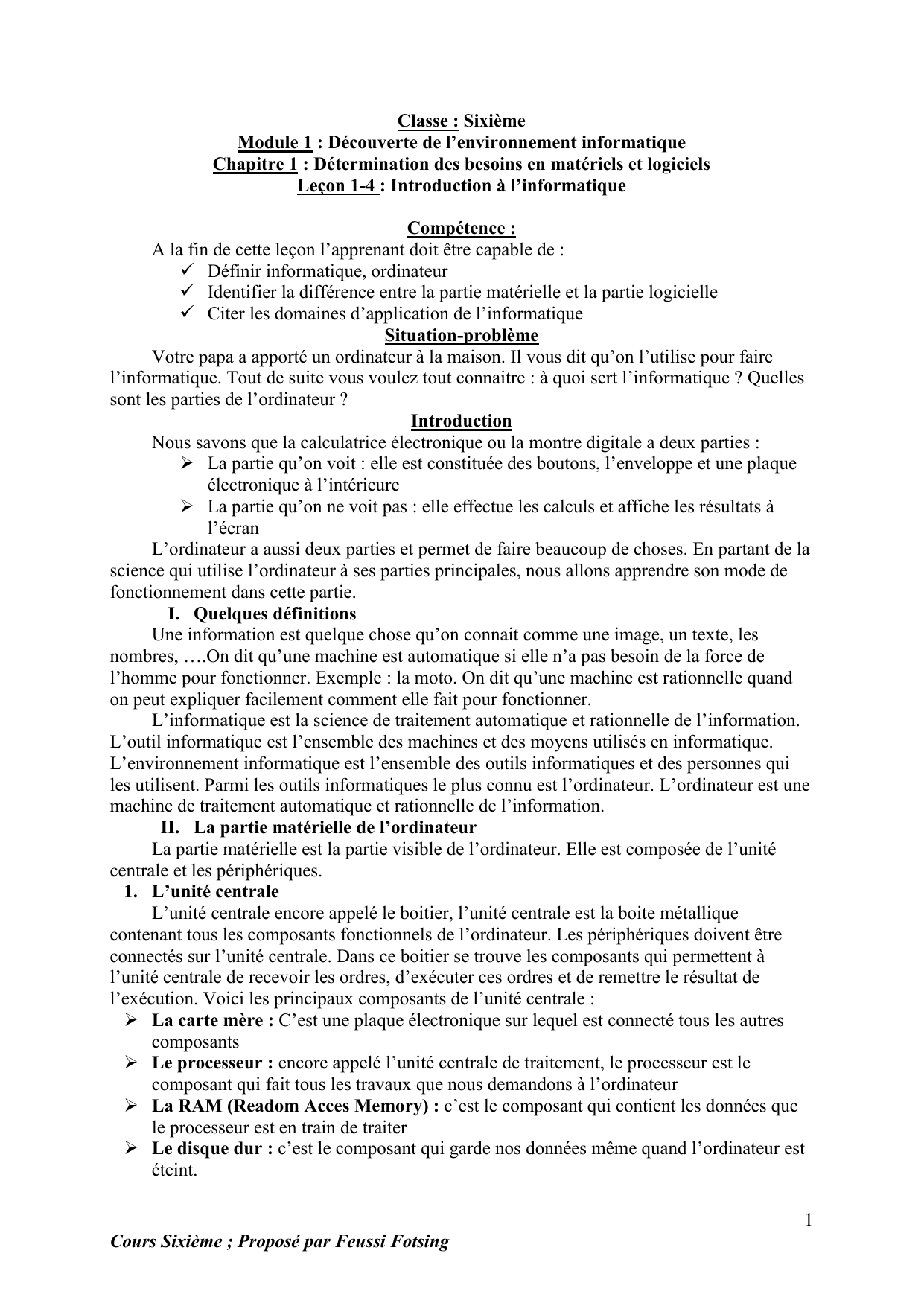 Cours Sixième ; Proposé par Feussi Fotsing