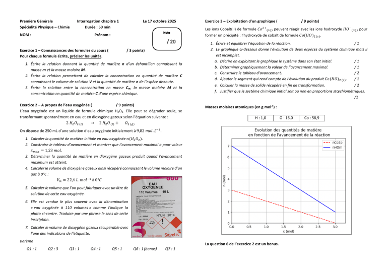 Première Générale Interrogation chapitre 1 Le 17 octobre 2025