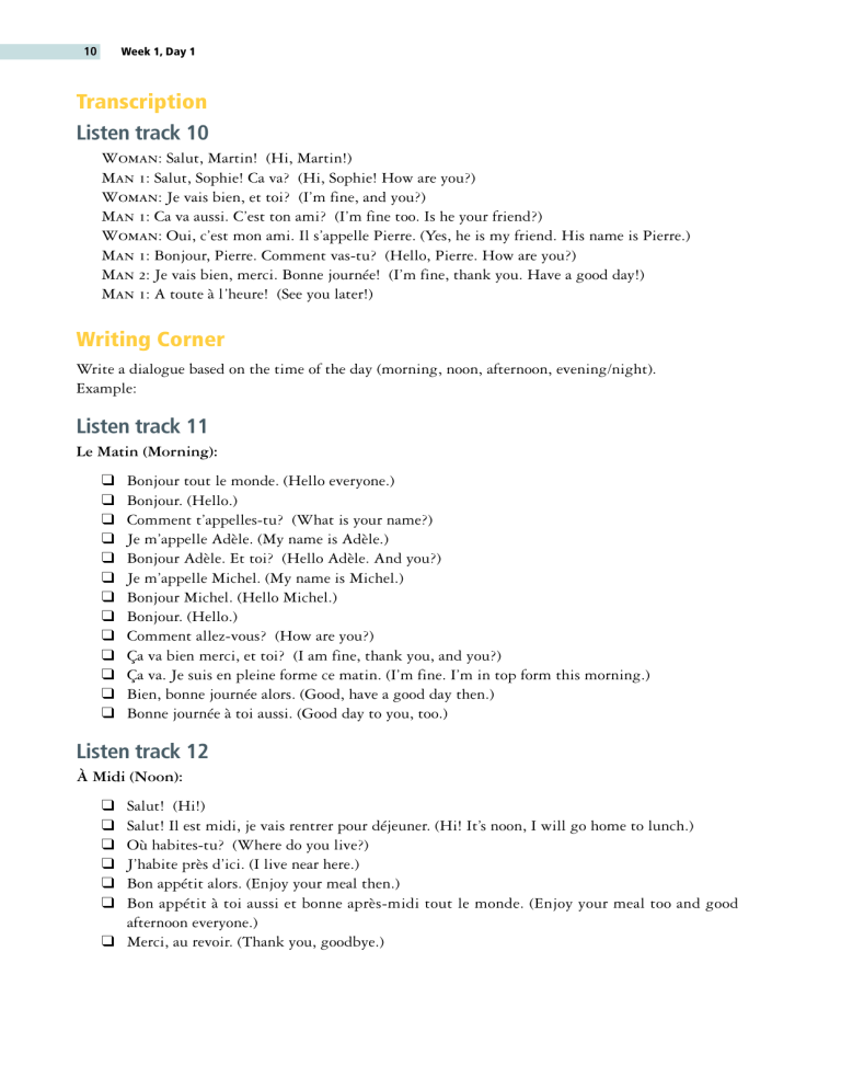 M : Je vais bien, merci. Bonne journée! (I’m fine, thank you. Have a good day!)