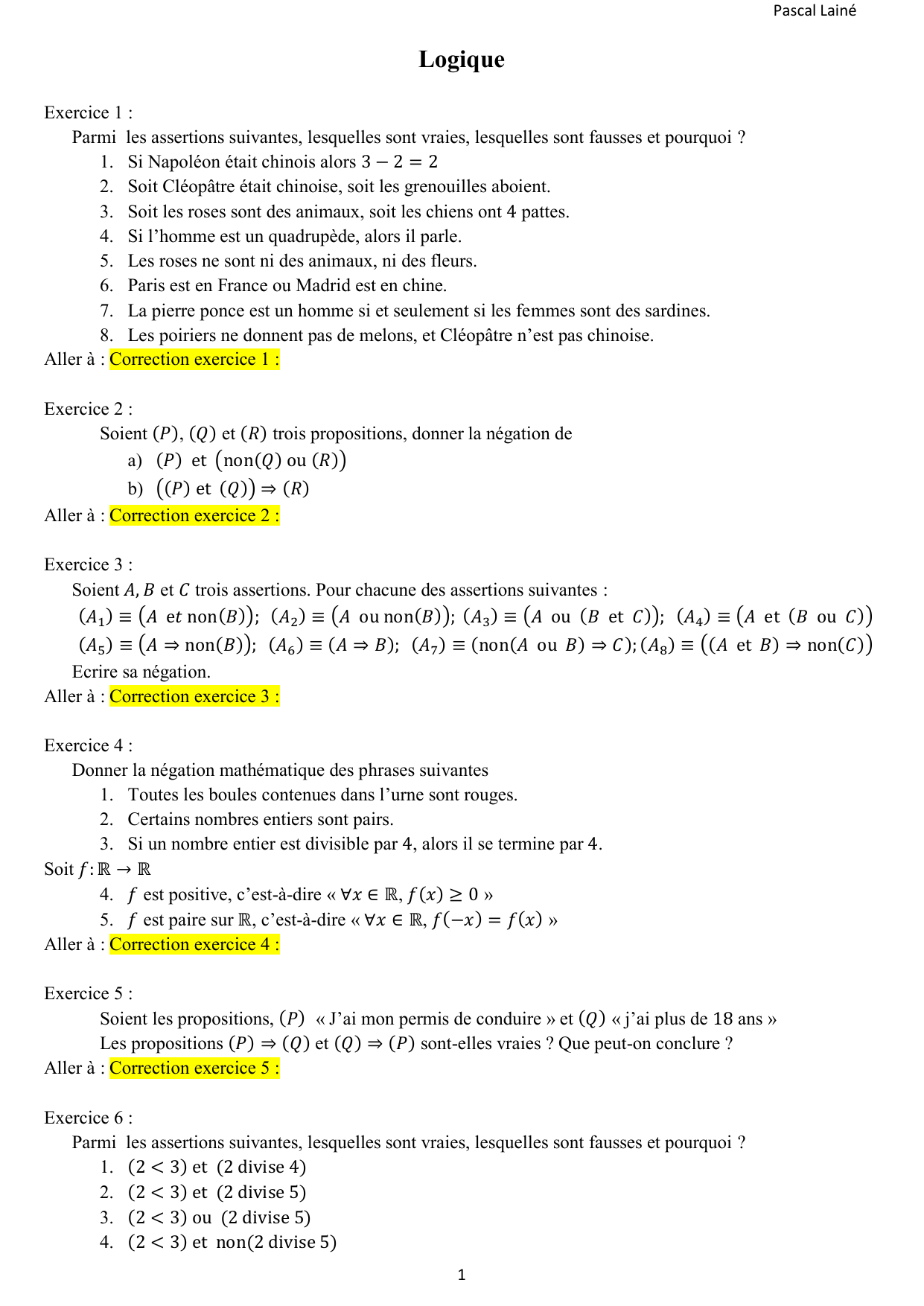 Exercices de Logique avec Corrections - Propositions, Négations, Quantificateurs
