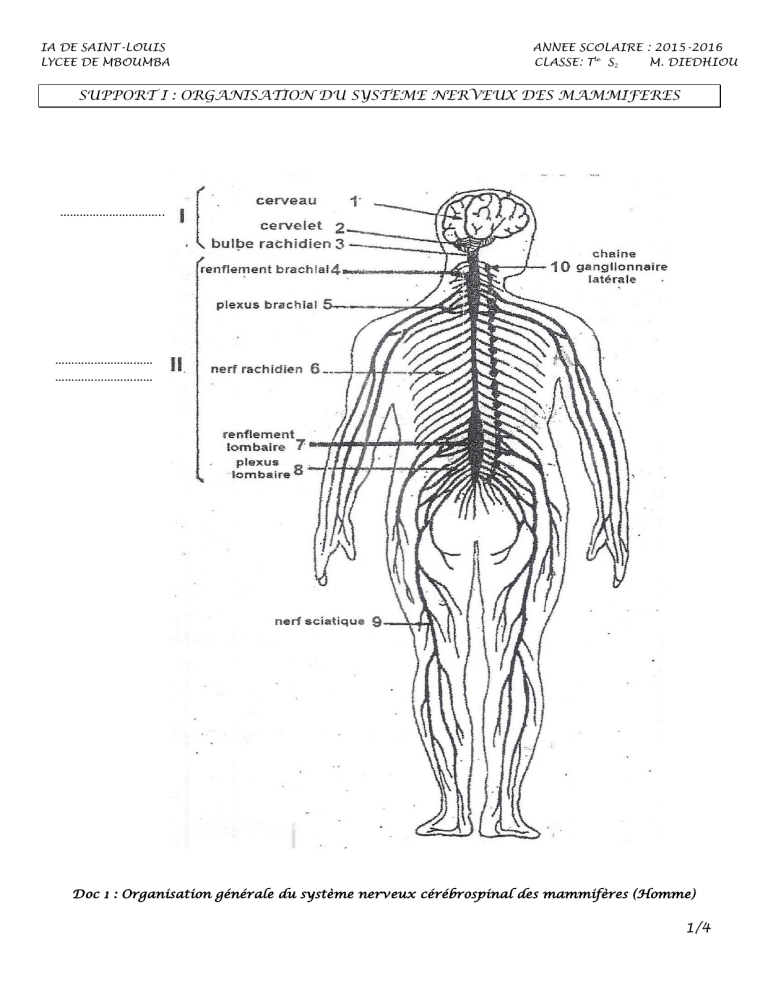 Doc 1 : Organisation générale du système nerveux cérébrospinal des mammifères (Homme)