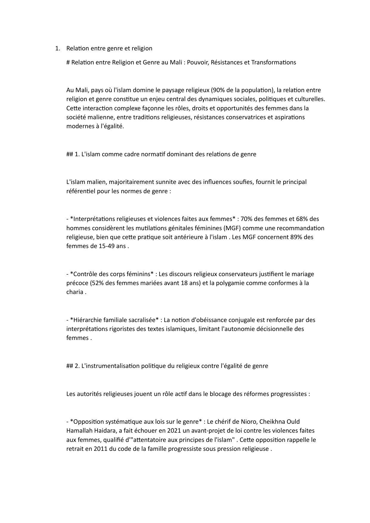 En dénive, la relaon entre religion et genre au Mali illustre une tension entre, d'une part,