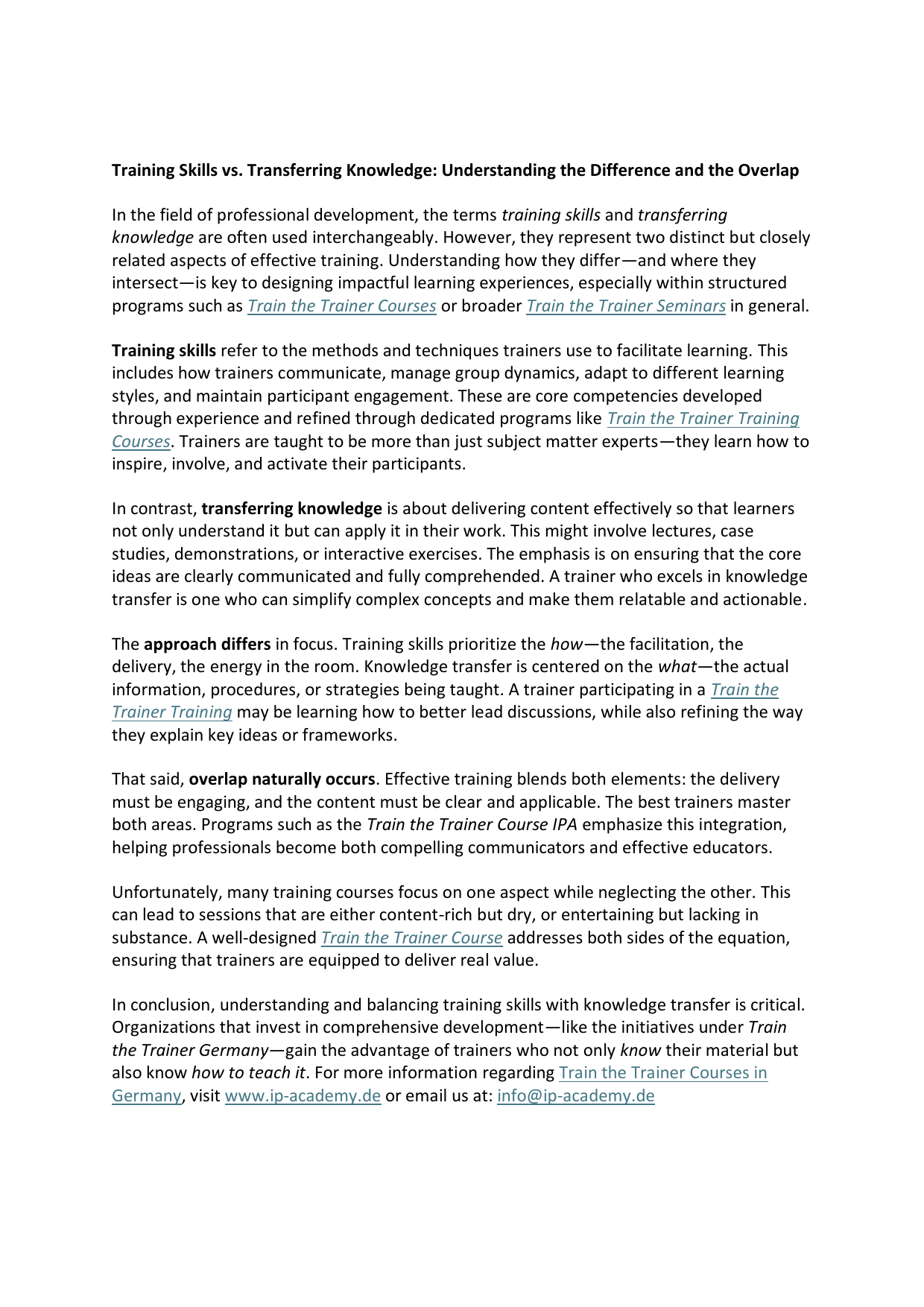 both areas. Programs such as the Train the Trainer Course IPA emphasize this integration,