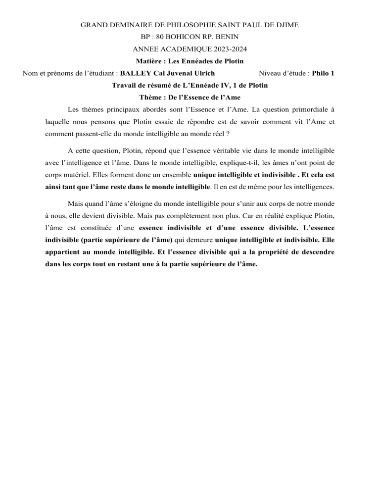 Nom et prénoms de l’étudiant : BALLEY Cal Juvenal Ulrich Niveau d’étude : Philo 1