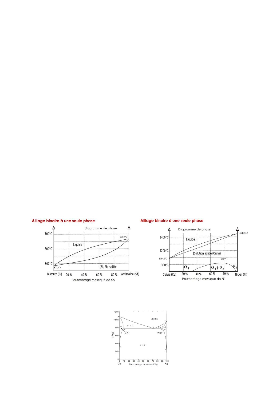 Alliages binaires à une seule phase : totalement solubles l’un dans l’autre, ex : Bi-Sb ou Cu-Ni