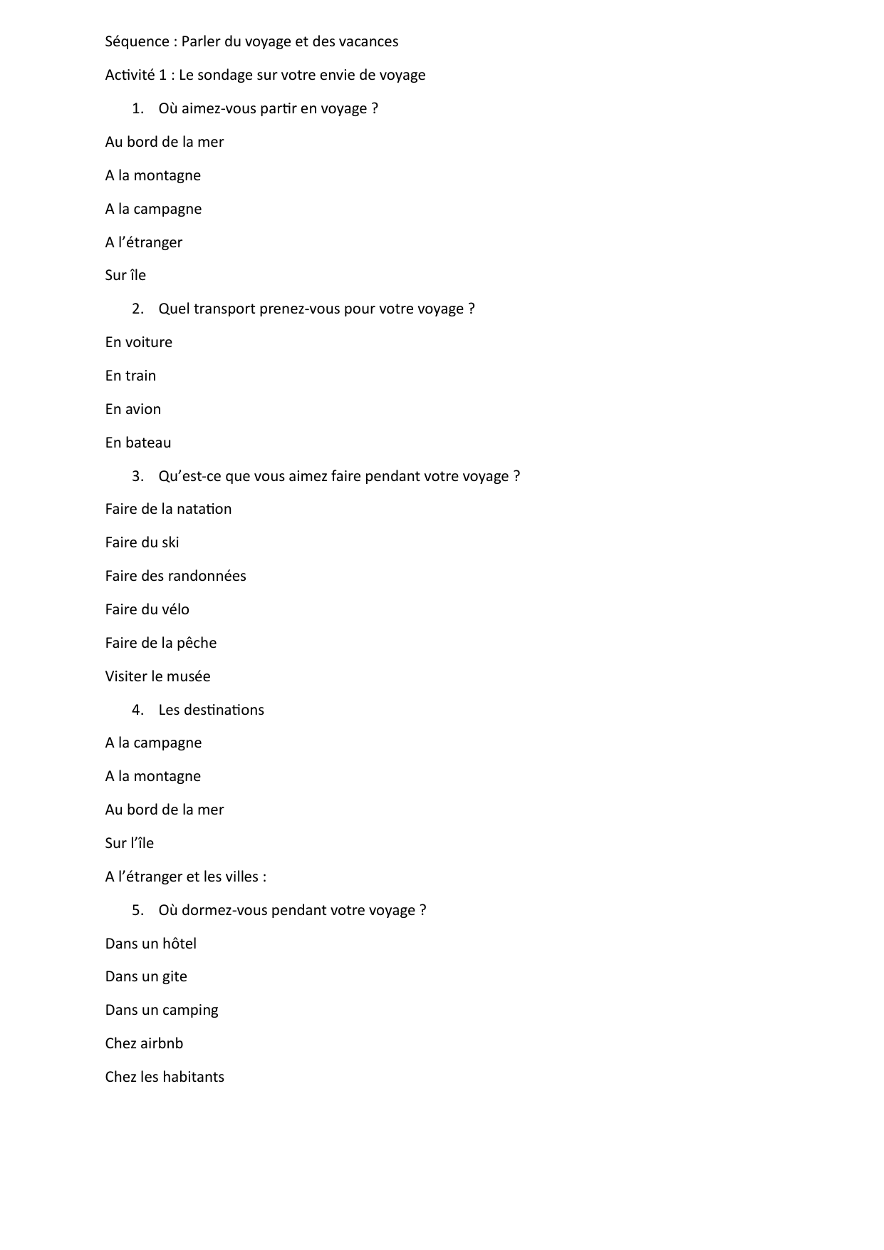 1. Où aimez-vous parr en voyage ?