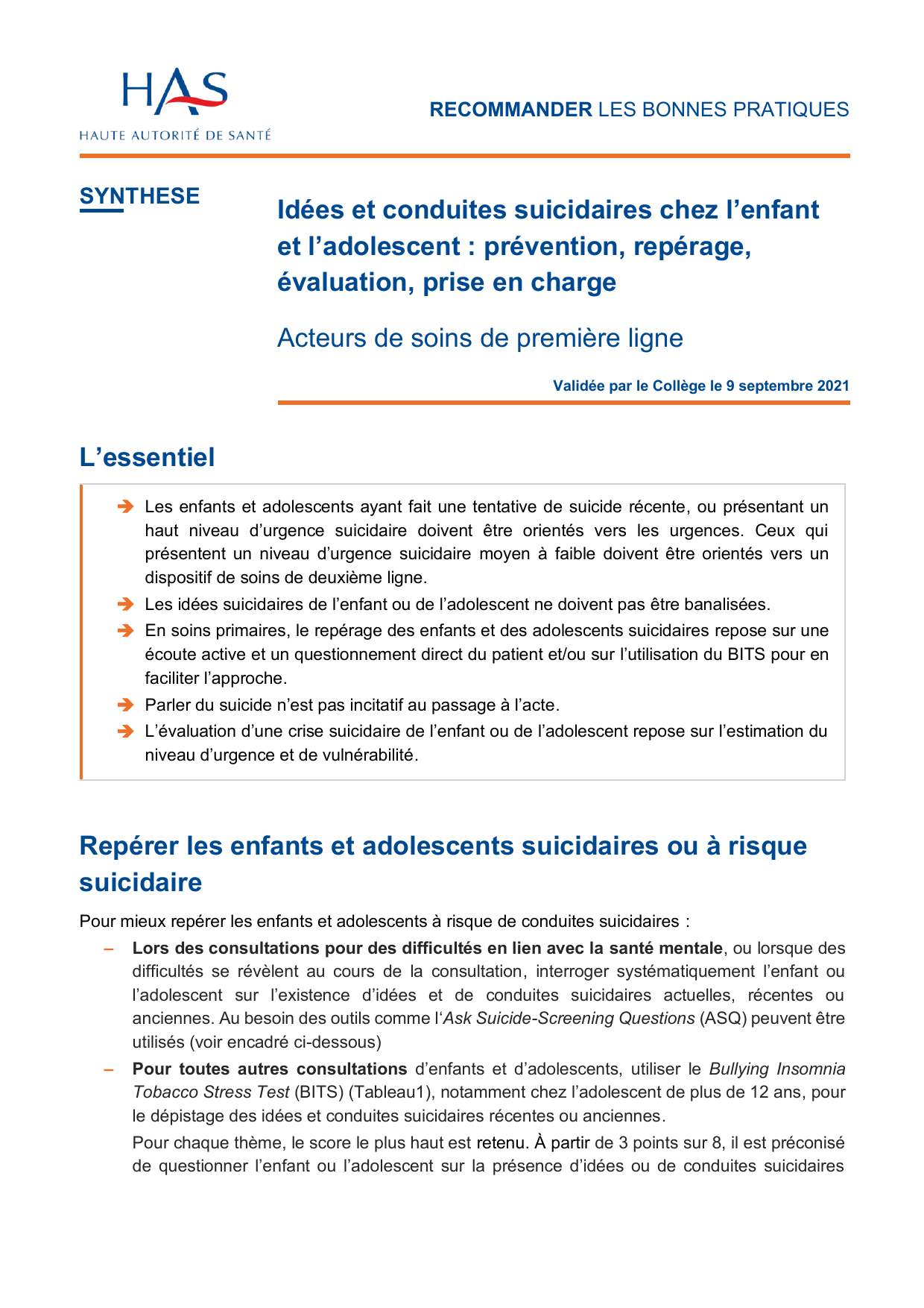 Tout enfant ou adolescent ayant fait une tentative de suicide récente doit être orienté vers un service