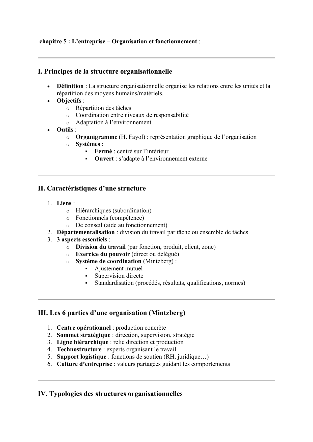o Organisation par grandes fonctions (technique, commerciale, financière…)
