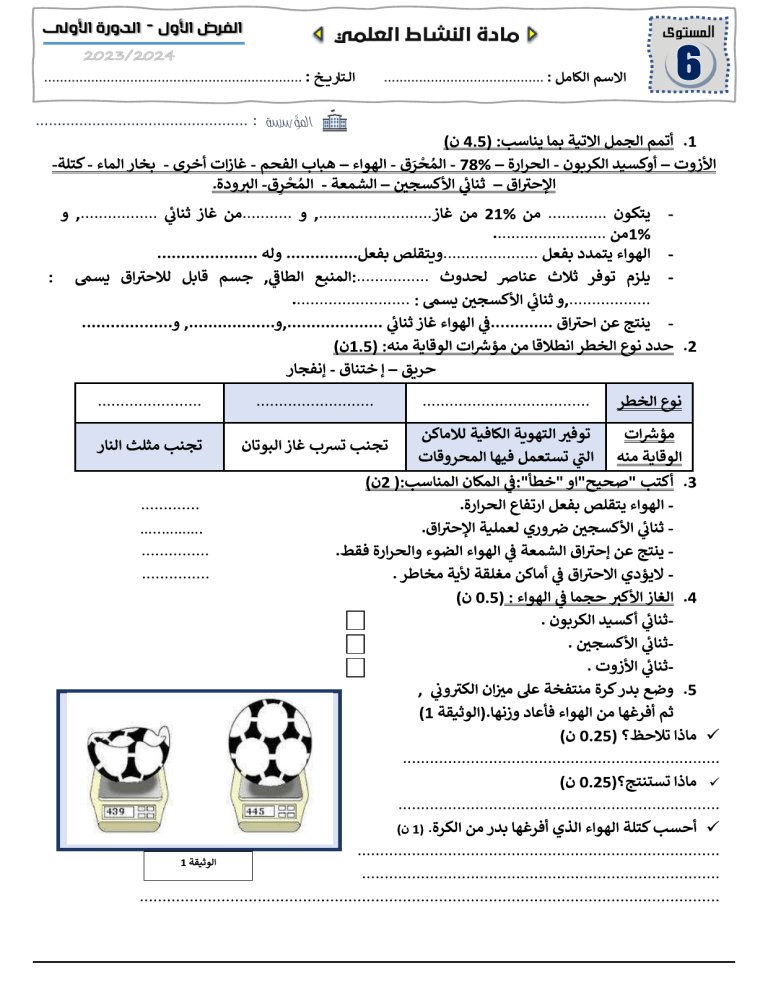 Évaluation de Sciences Physiques - Air, Combustion et Gaz (Niveau 6)