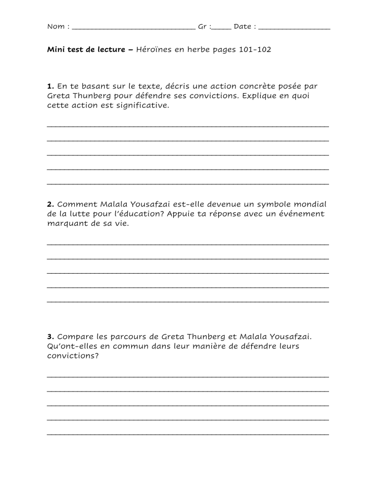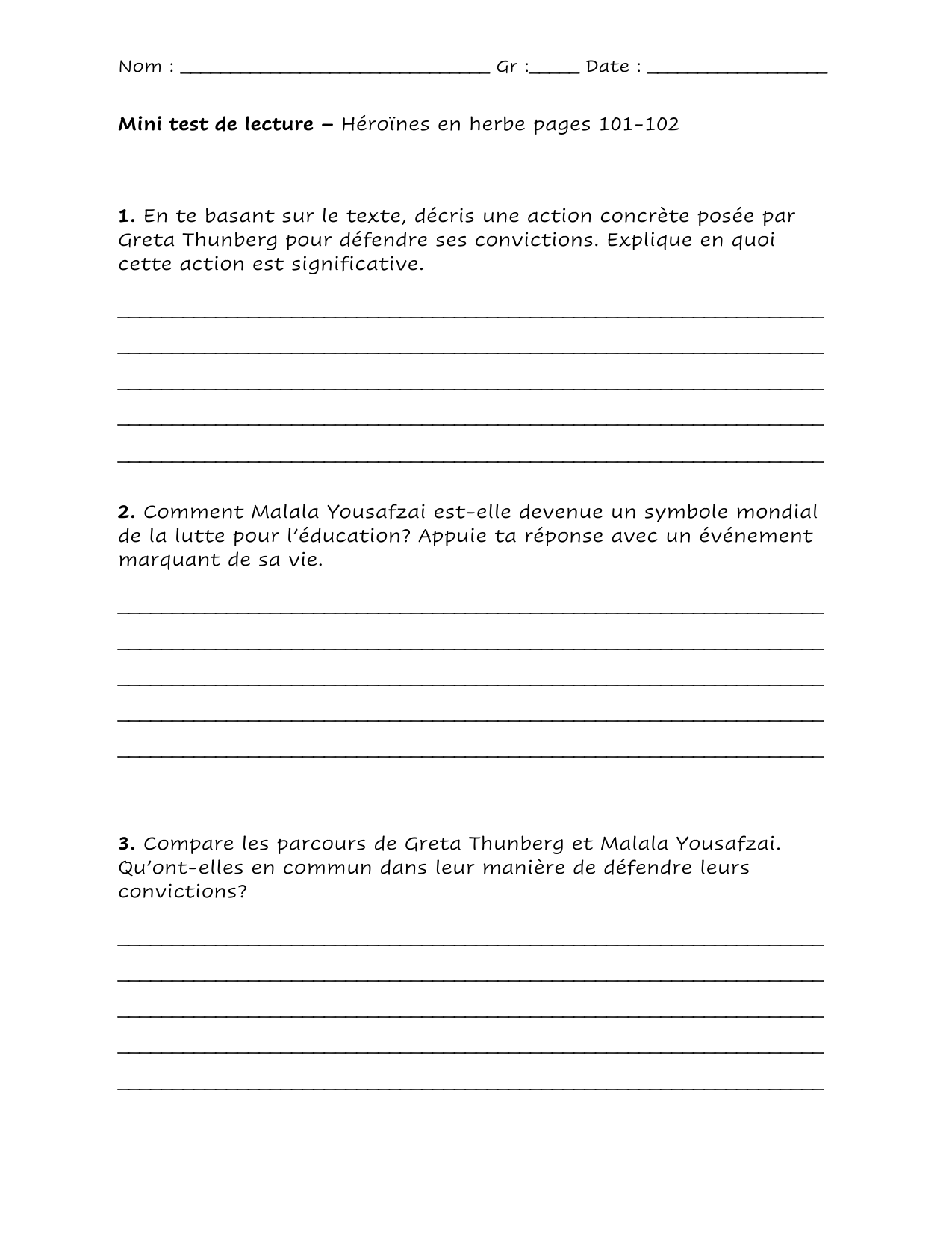 Mini test de lecture – Héroïnes en herbe pages 101-102
