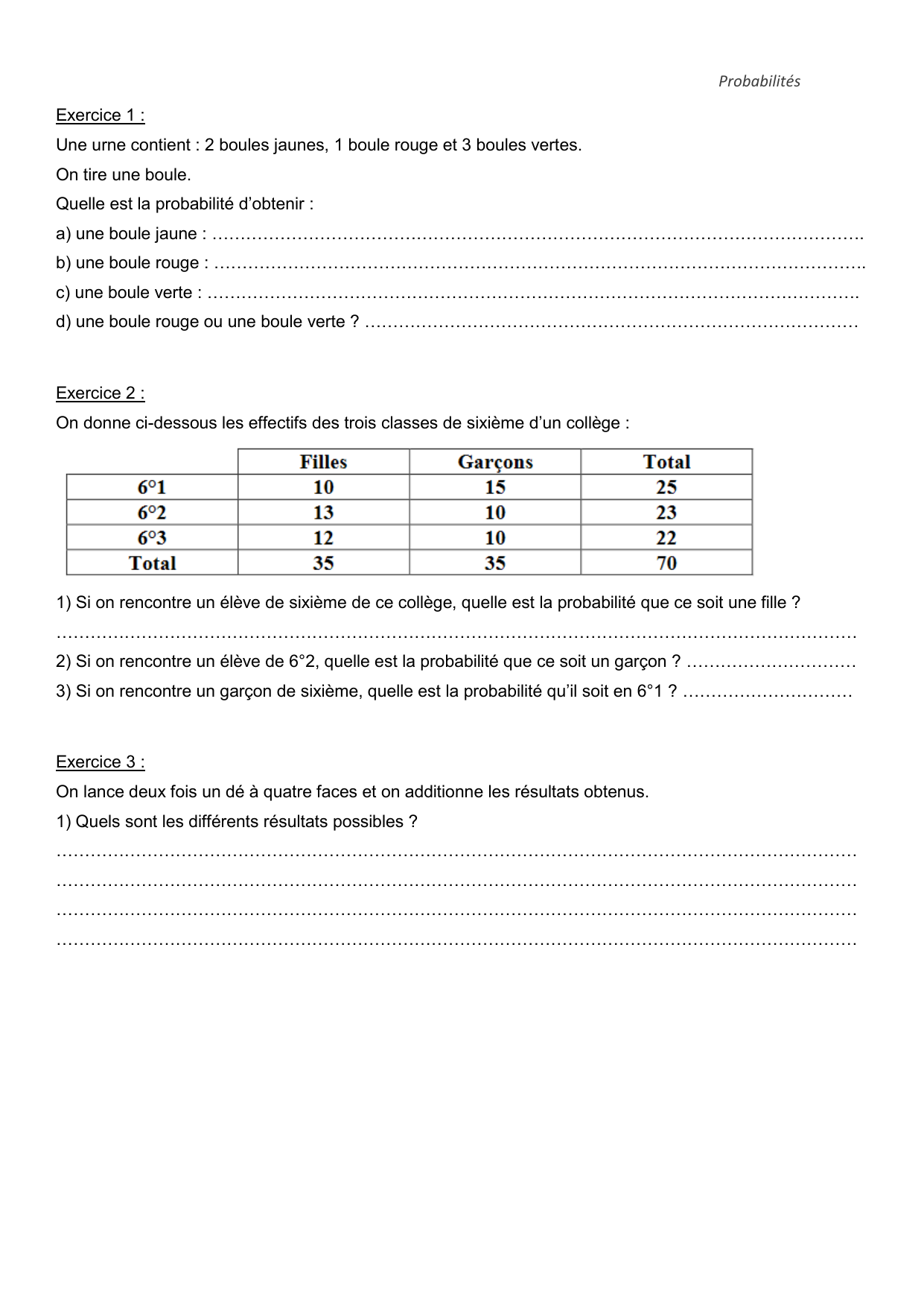3) Si on rencontre un garçon de sixième, quelle est la probabilité qu’il soit en 6°1 ? …………………………