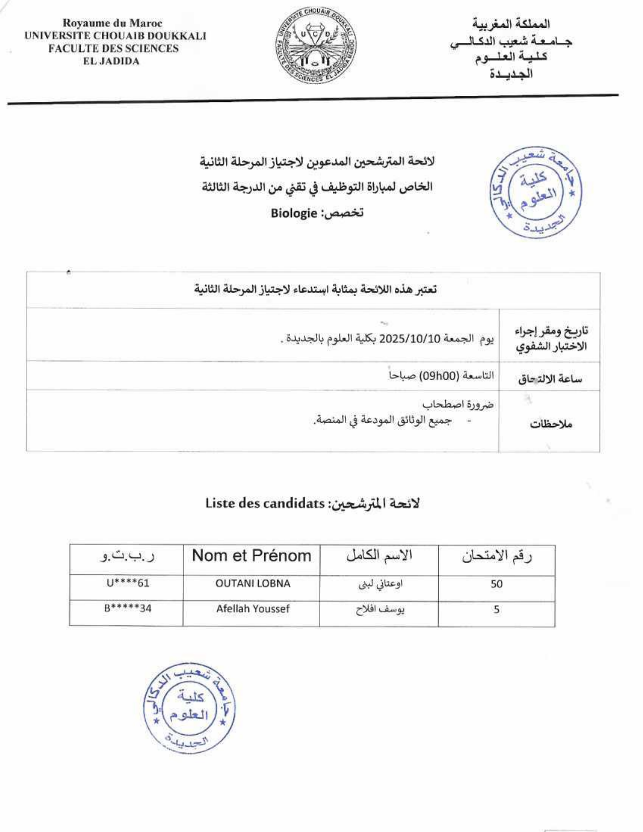 Liste candidats concours Biologie Univ. Chouaib Doukkali