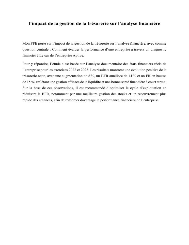 Mon PFE porte sur l’impact de la gestion de la trésorerie sur l’analyse financière, avec comme