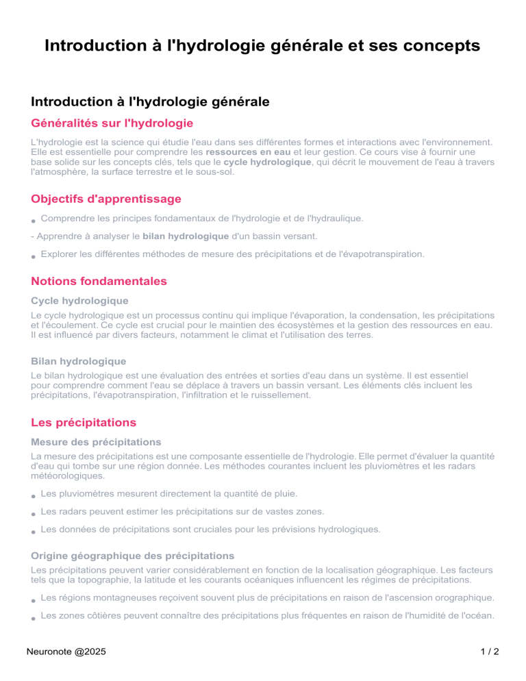 Elle est essentielle pour comprendre les ressources en eau et leur gestion. Ce cours vise à fournir une