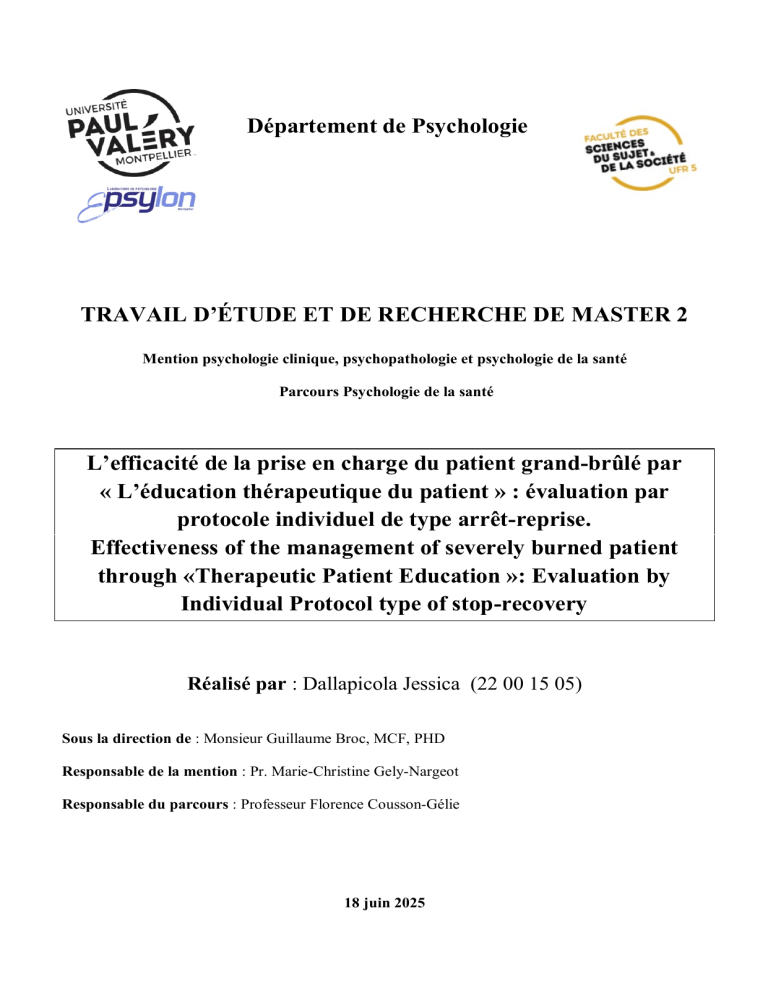 Keywords: Severe burn / PTE / Effectiveness / Single-case design / Adaptive strategies.