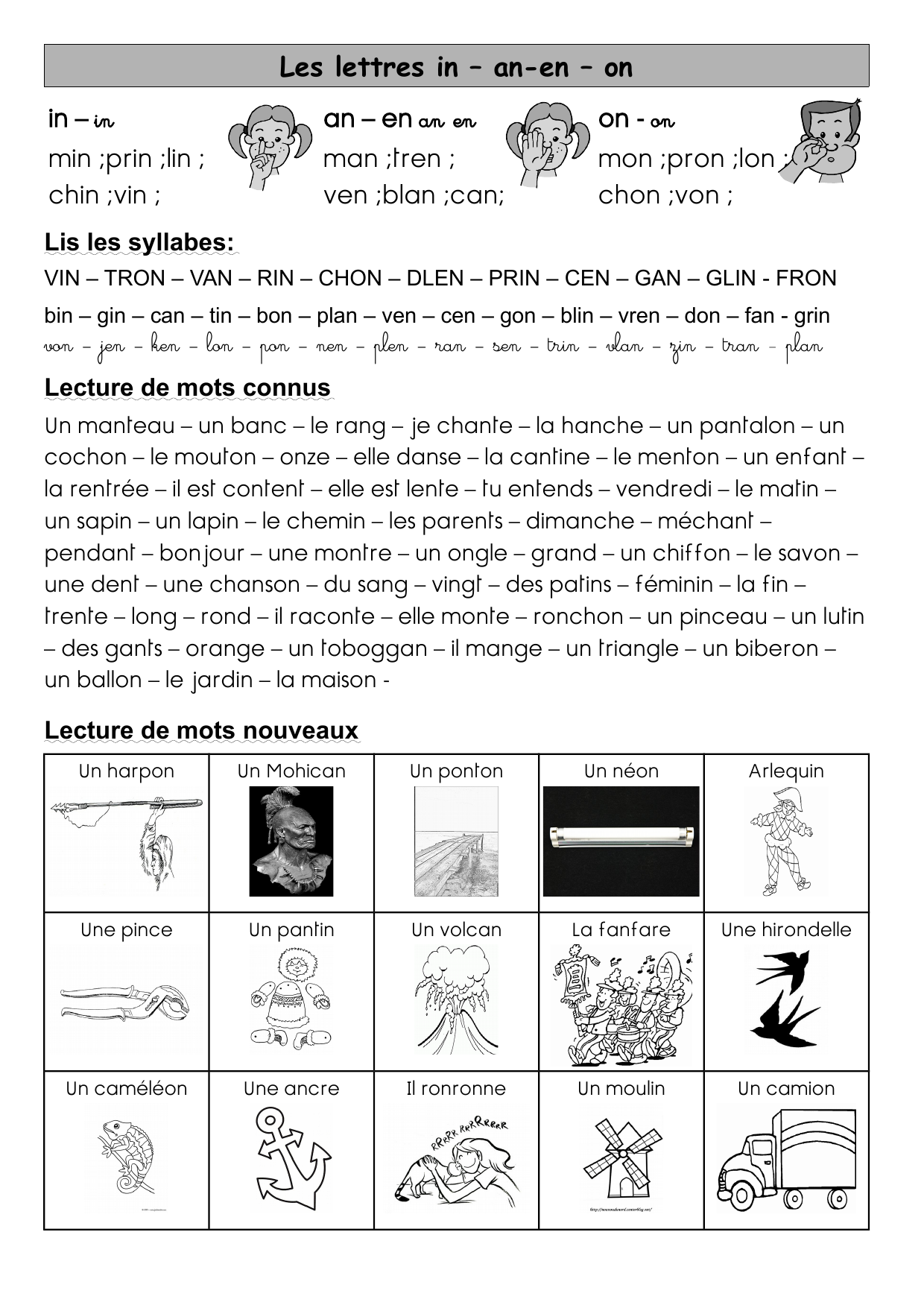 cochon – le mouton – onze – elle danse – la cantine – le menton – un enfant –