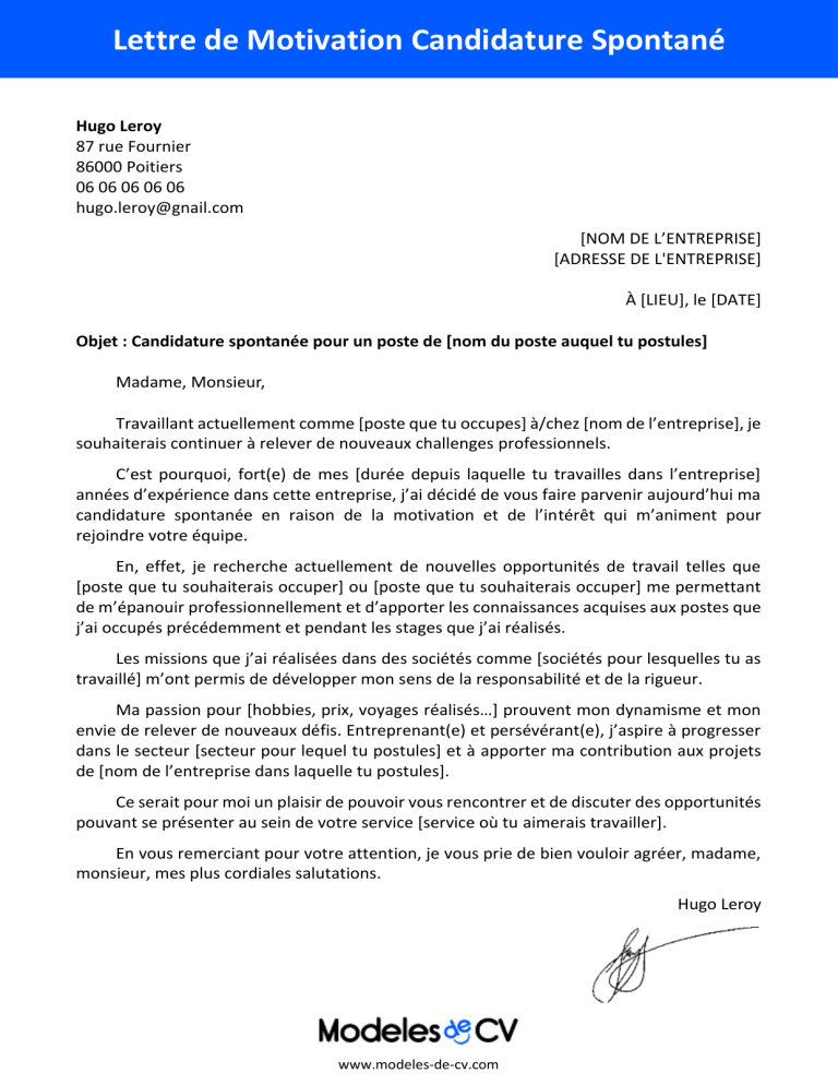 candidature spontanée en raison de la motivation et de l’intérêt qui m’animent pour
