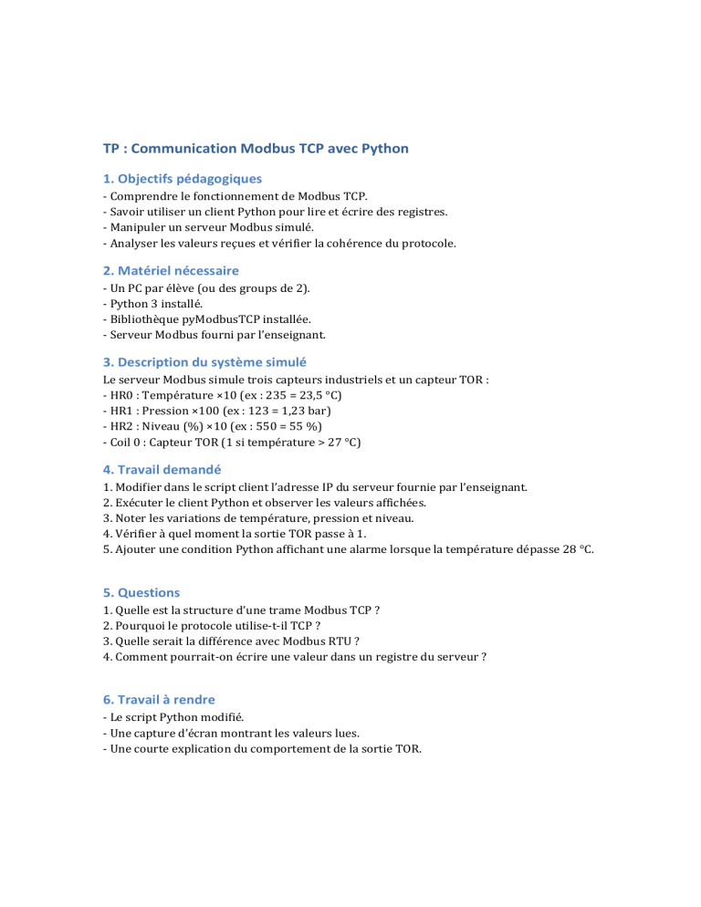 TP : Communication Modbus TCP avec Python