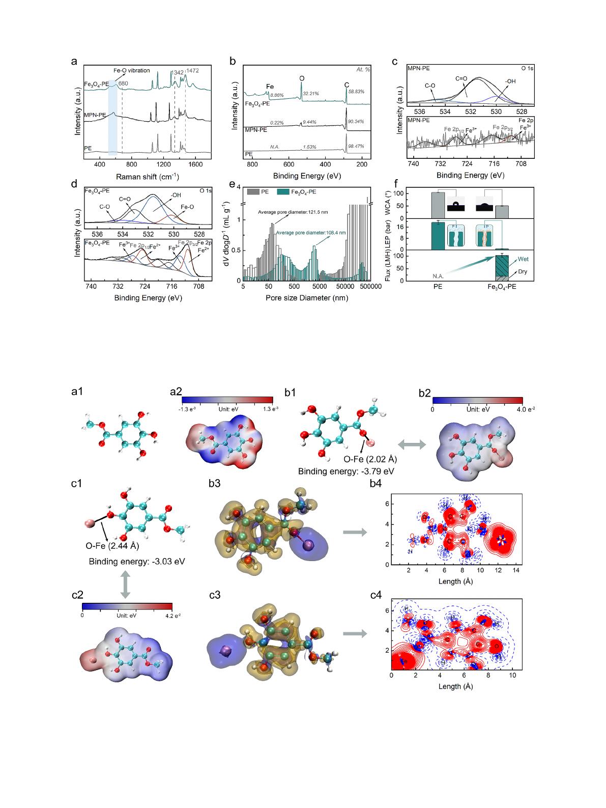 –OH, C =O, and C-O peaks in MPN-PE, while the Fe 2p spectrum