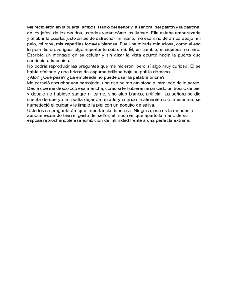 Me recibieron en la puerta, ambos. Hablo del señor y la señora, del patrón y la patrona,