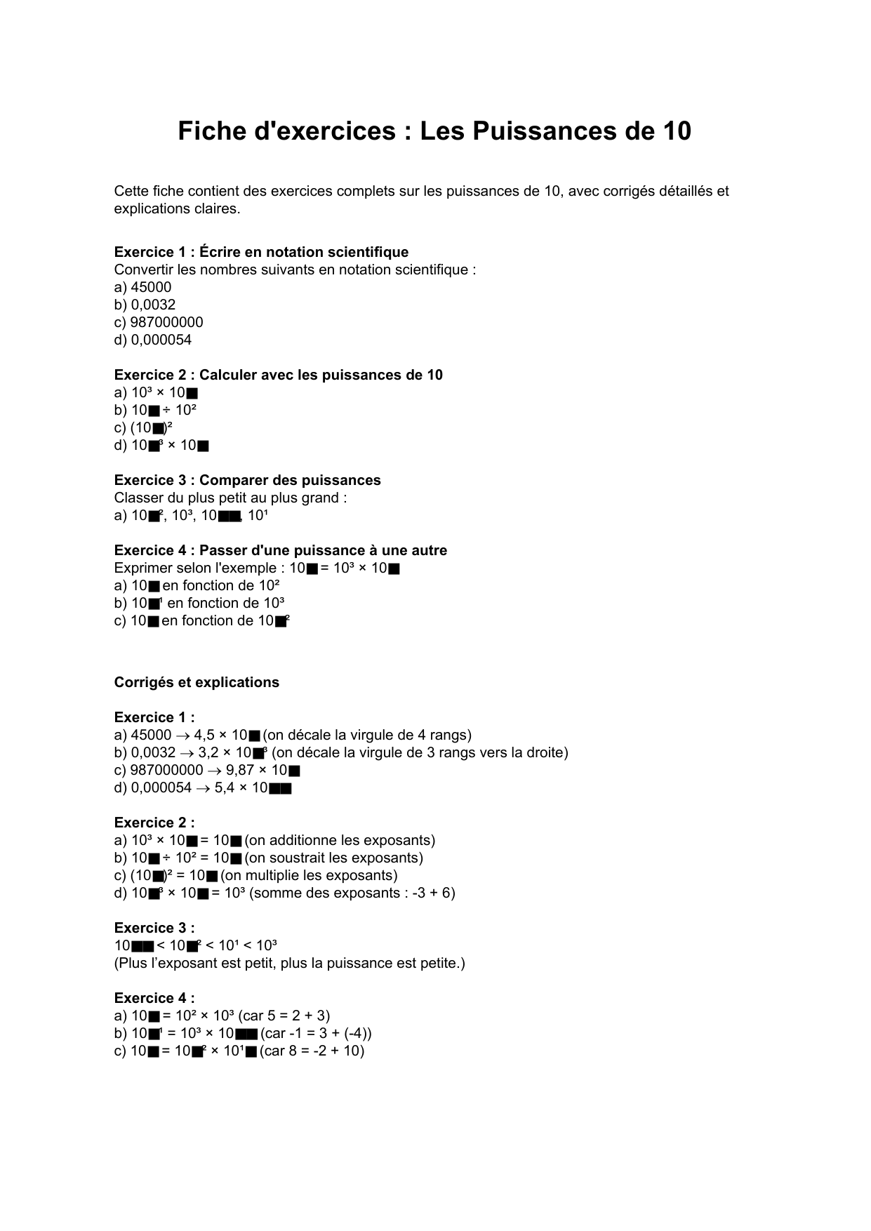Cette fiche contient des exercices complets sur les puissances de 10, avec corrigés détaillés et