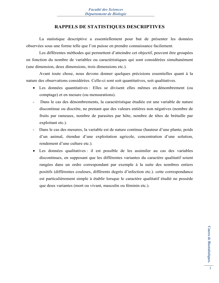 STATISTIQUES DESCRIPTIVES A UNE DIMENSION