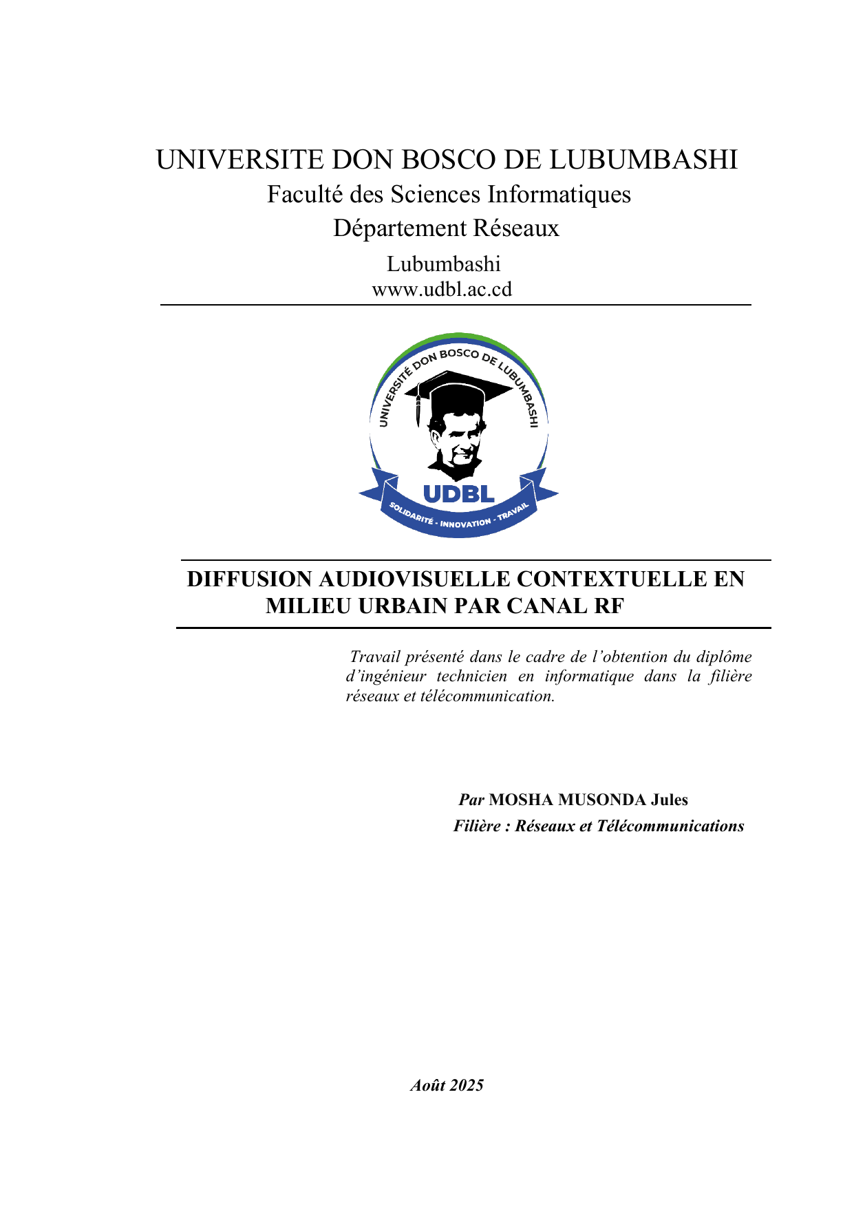l’UNIVERSITE DON BOSCO DE LUBUMBASHI (UDBL), en particulier à Monsieur