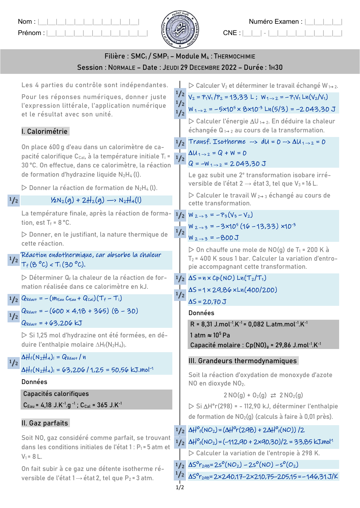 Capacité molaire : Cp(NO)g = 29,86 J.mol-1.K-1