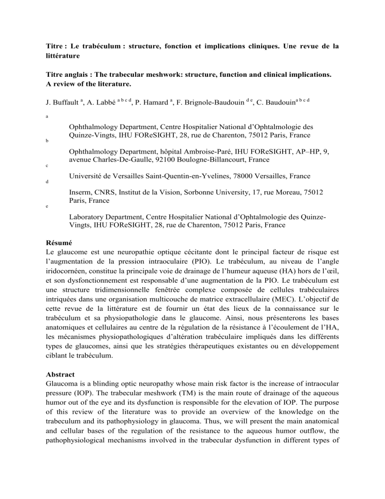 Titre anglais : The trabecular meshwork: structure, function and clinical implications.
