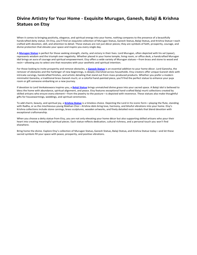 handcrafted deity statue. On Etsy, you’ll find an exquisite collection of Murugan Statue, Ganesh Statue, Balaji Statue, and Krishna Statue—each